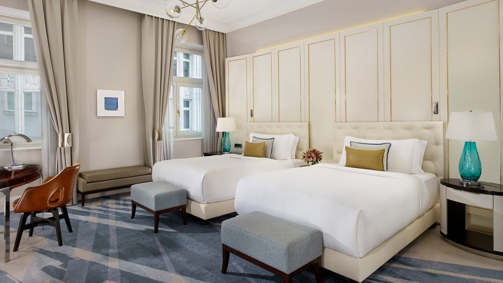 Sophisticated 2 queen-sized bedroom with a spacious layout and elegant décor with beautiful city or park views. The room features bathroom with separate bathtub and shower, a flat-screen tv with satellite channels, mini bar, 24-hour room service, coffee & tea making facilities and evening turndown service.