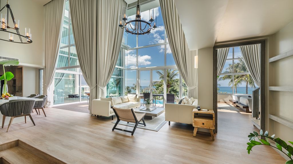 The resort follows a true “all suites, all private” concept. Spaces range from intimate hideaways to expansive beachfront retreats, each designed to emphasize privacy and fluid indoor-outdoor living. Floor-to-ceiling glass brings in a wash of sea light, while private pools and terraces create spaces to relax. For families or groups, larger multi-bedroom options with generous living areas offer the feel of a contemporary home-by-the-sea.