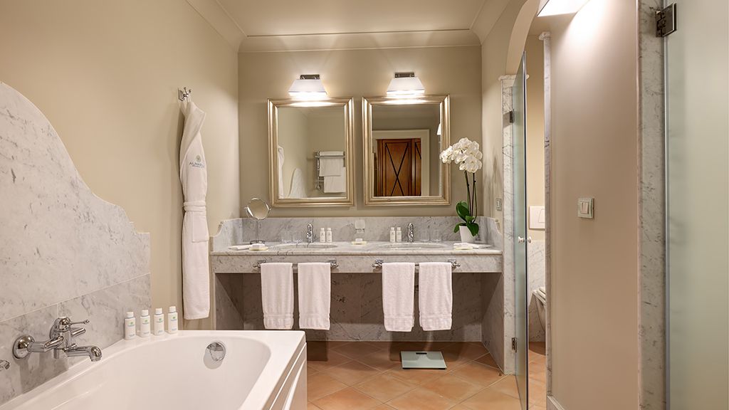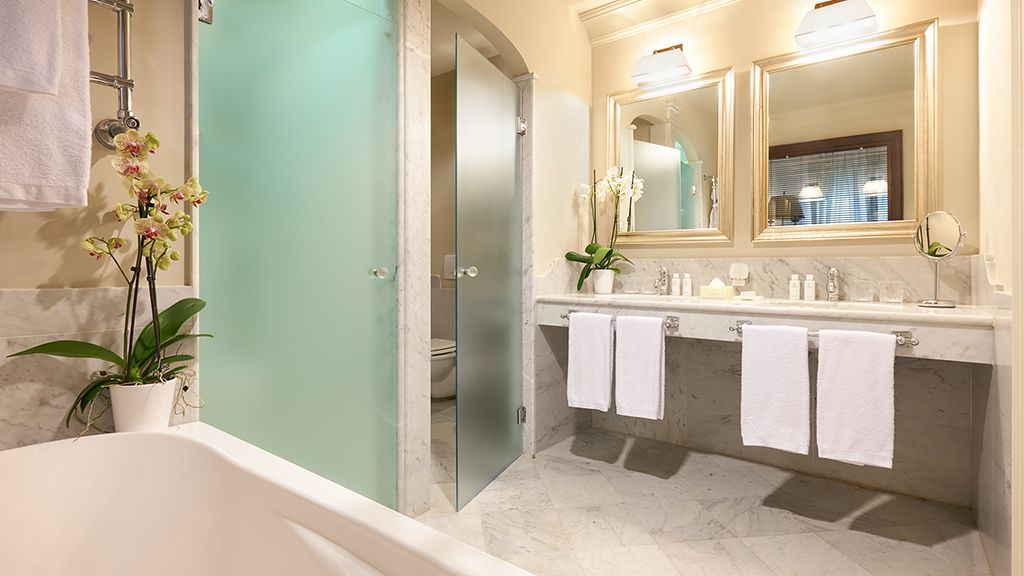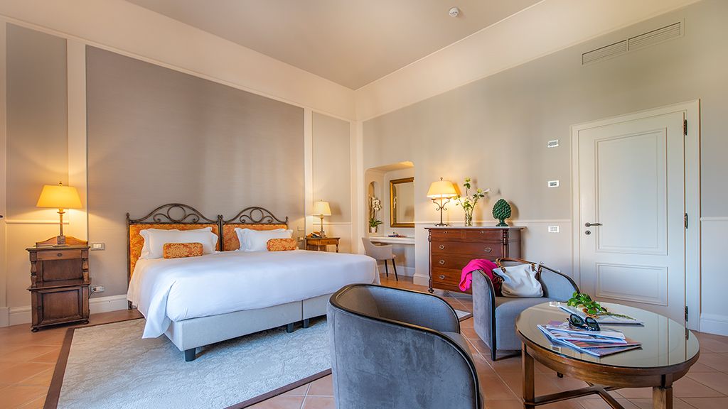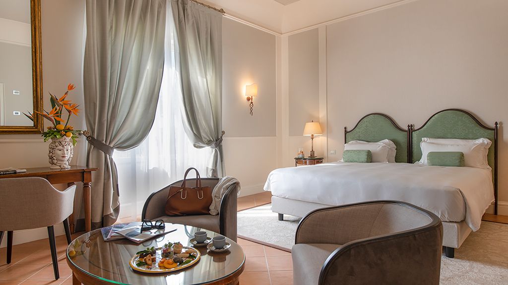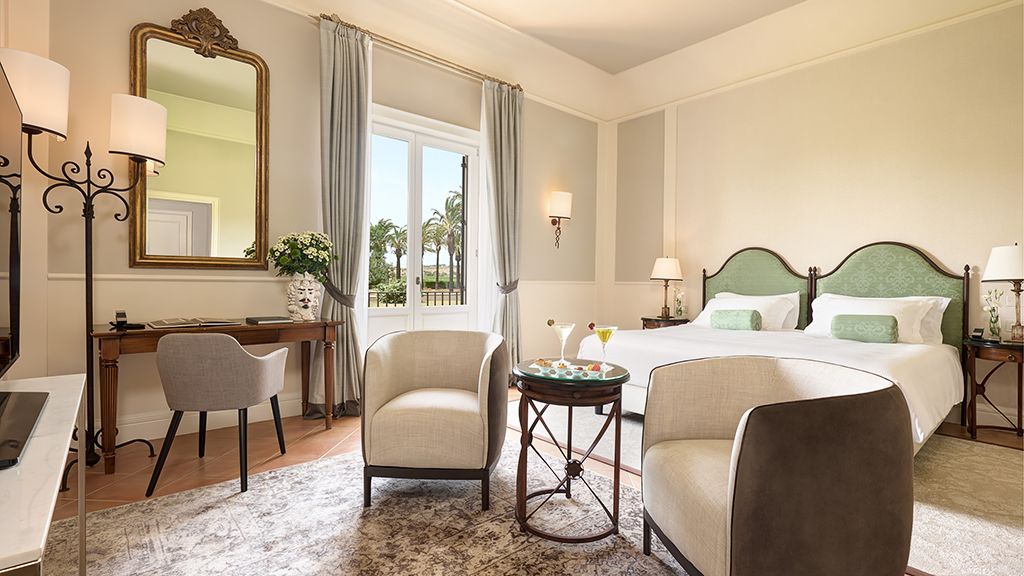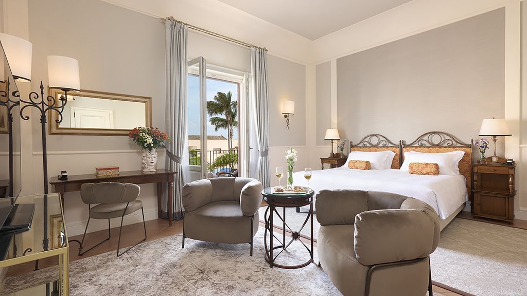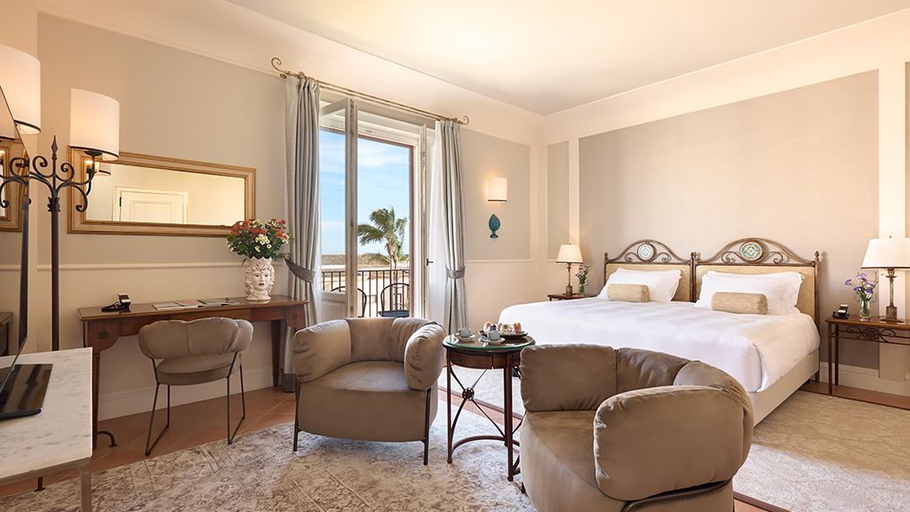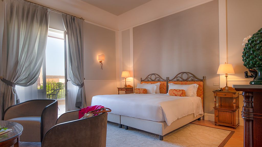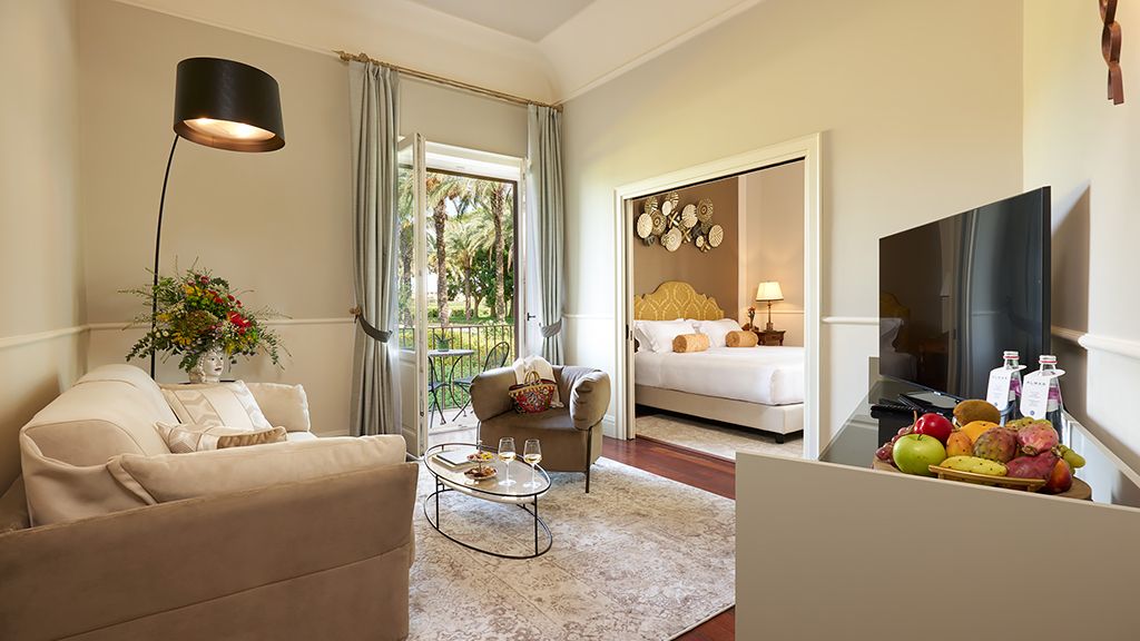 Guests arrive via a central courtyard with a mosaic waterfall and sun terrace. Within, the 88 guest accommodations consist of spacious Junior Suites and Suites, each decorated in typically lavish Sicilian style. The marble bathrooms with tubs are a delightful highlight, while each accommodation also features a balcony or terrace overlooking the pool or garden.