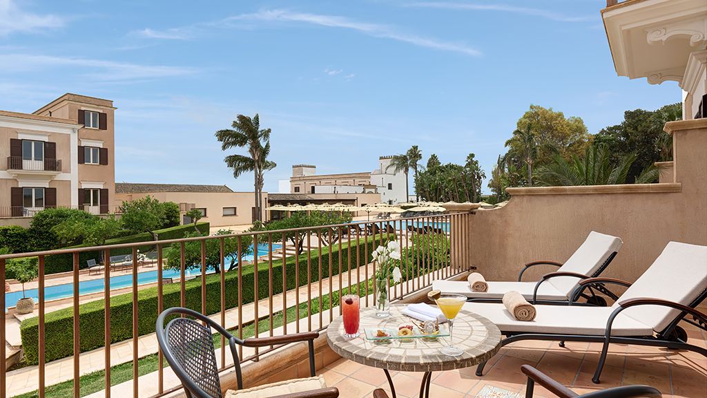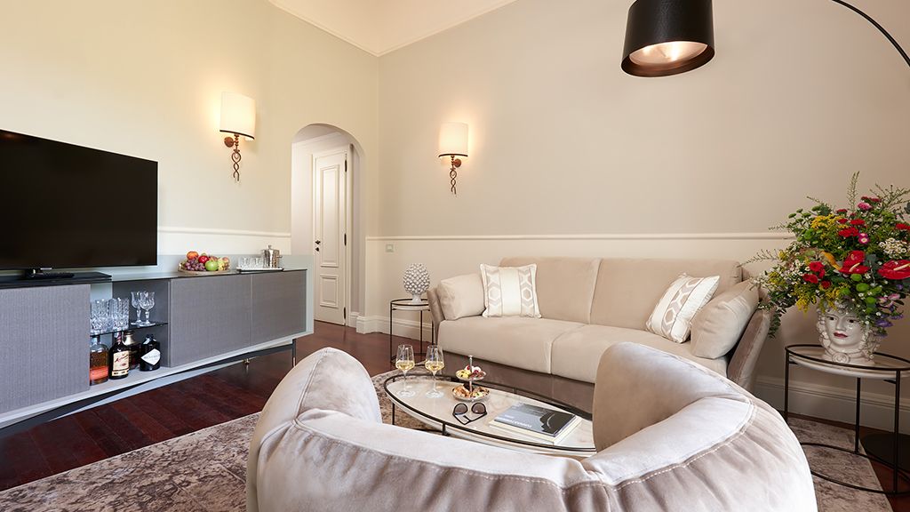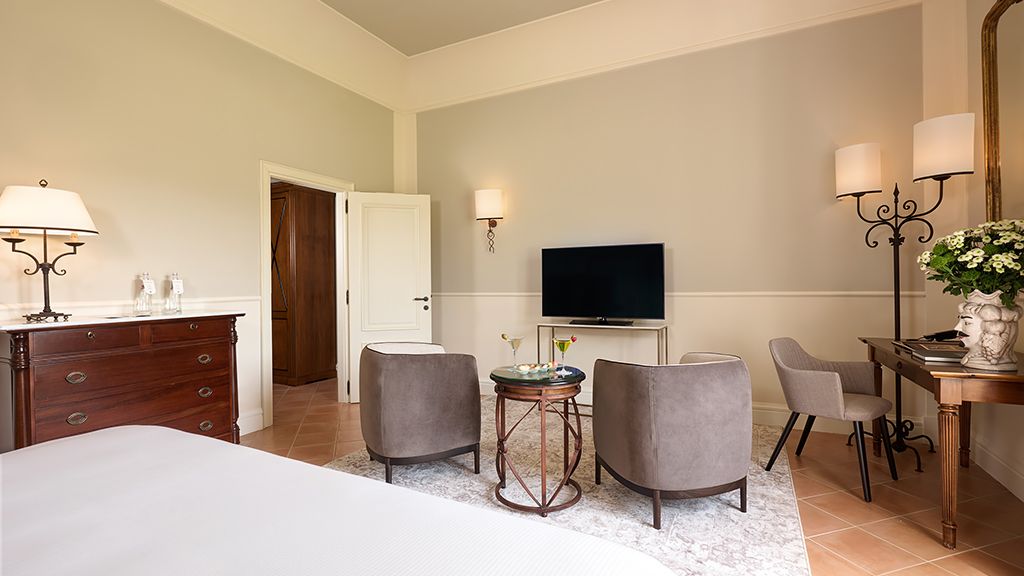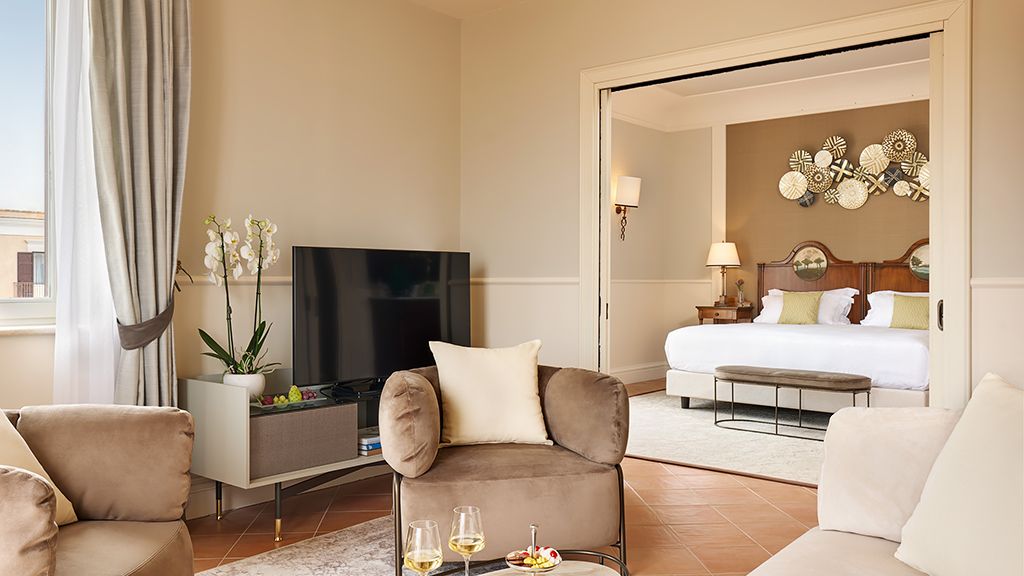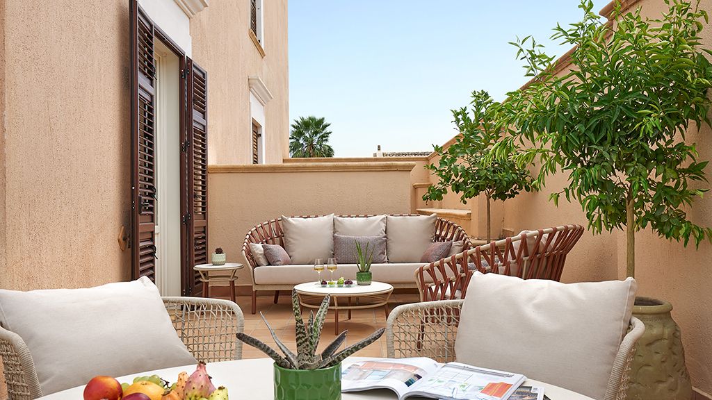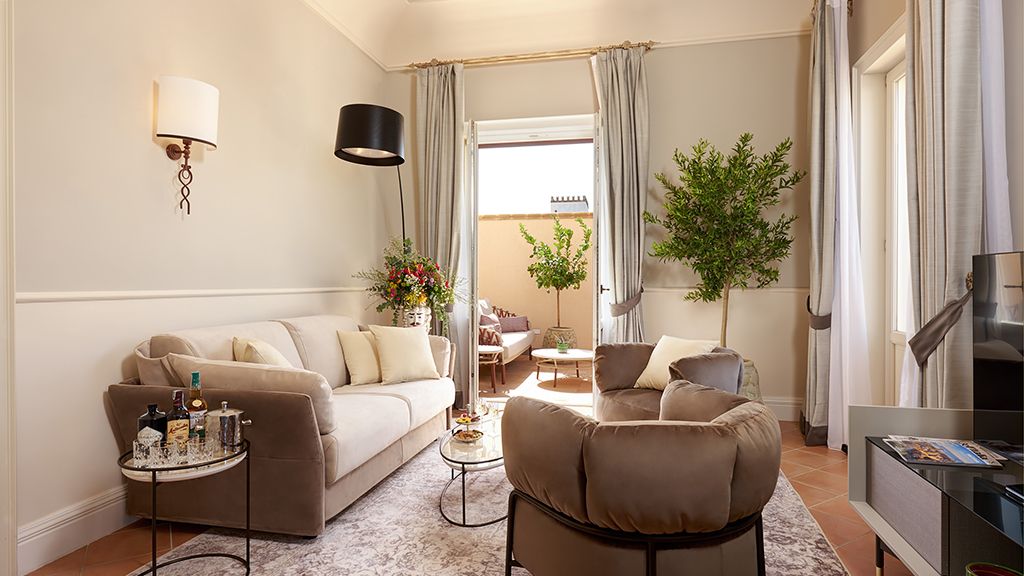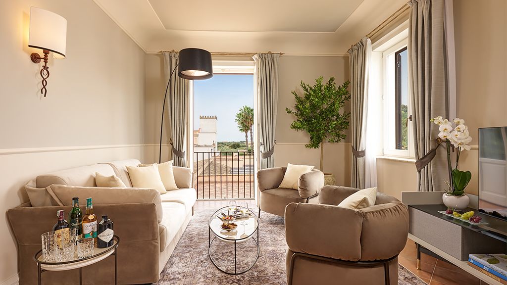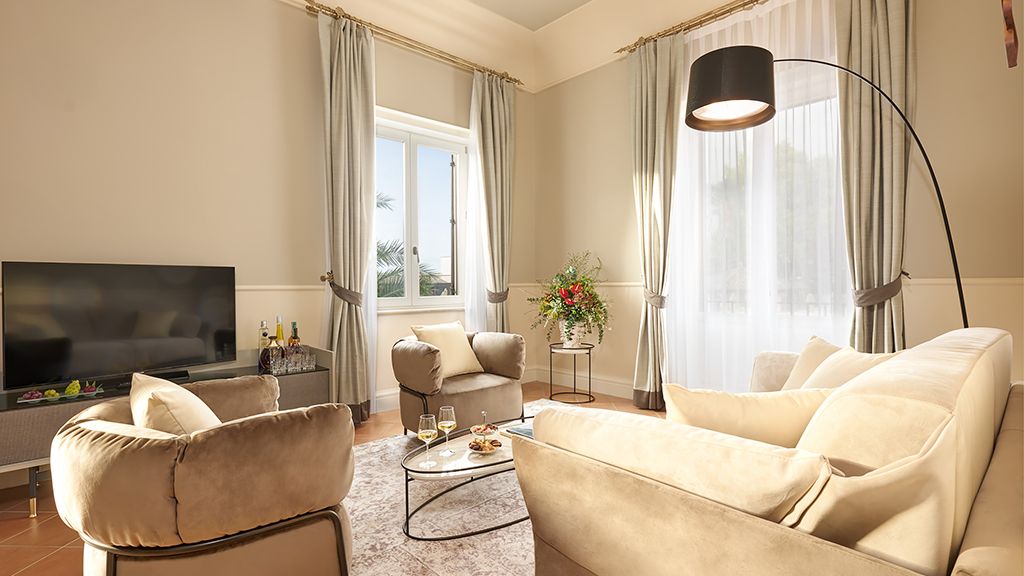 Double lcd sat tv, living room with sofa bed, safe, minibar, phone and desk, bathroom with double vanity, walk-in shower and tub, second service bathroom, private terrace furnished with sun loungers