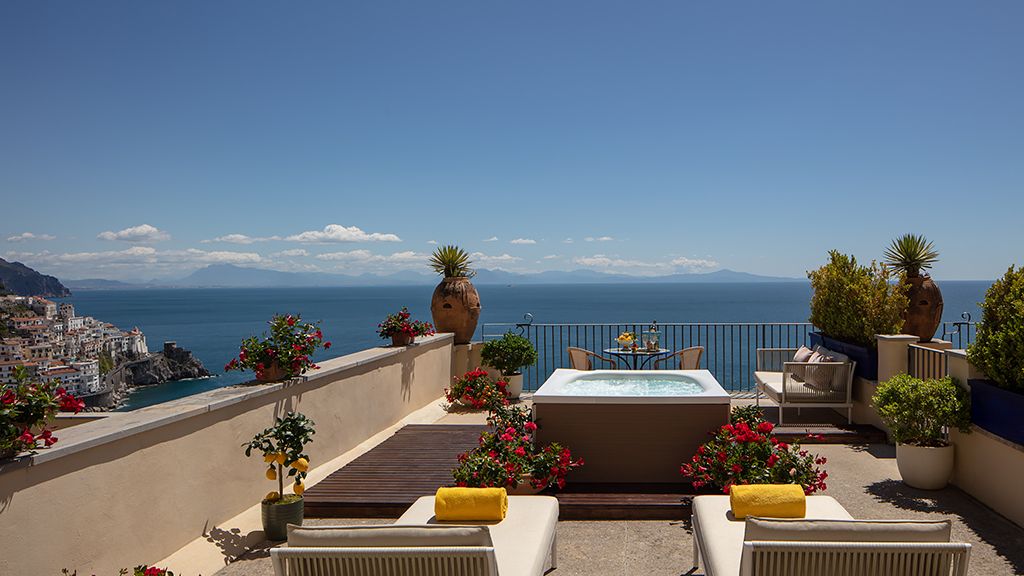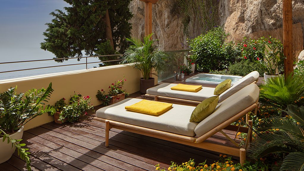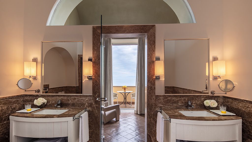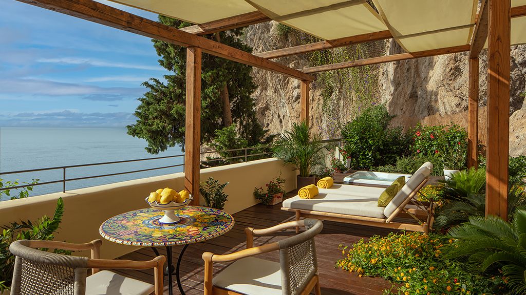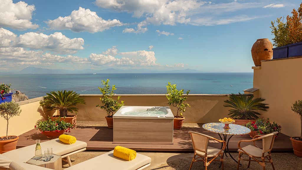 Suite dell’eremita sea view with terrace and jacuzzi. King bed. Free wi-fi. 85 sqm / 915 sqft eur200 credit per stay or convent tour with friar marcus. Free non-alcoholic minibar beverages. In-suite check-in / check-out. Ironing of 2 garments per day. Complimentary use of house car sea view. Jacuzzi with a view separate living room. Private terrace. Combined tub and rain shower.