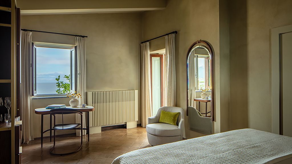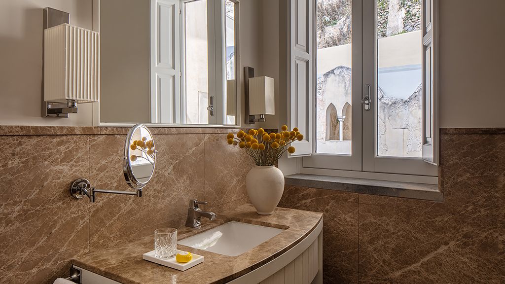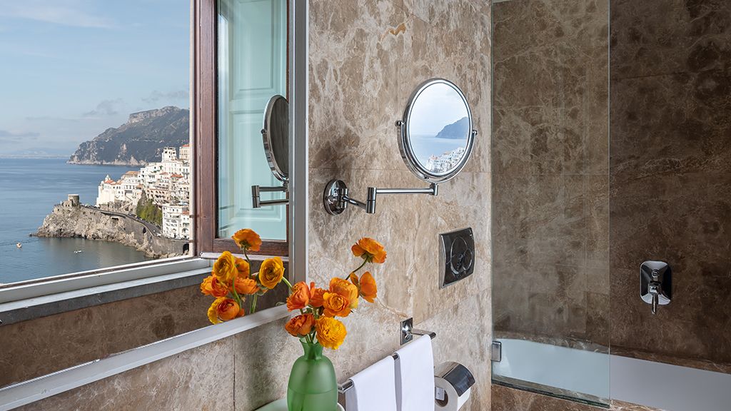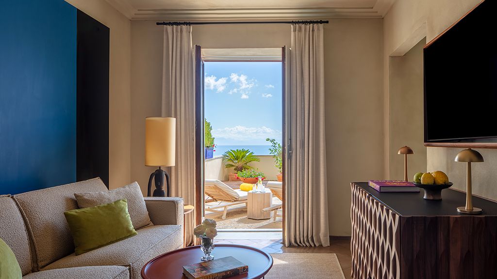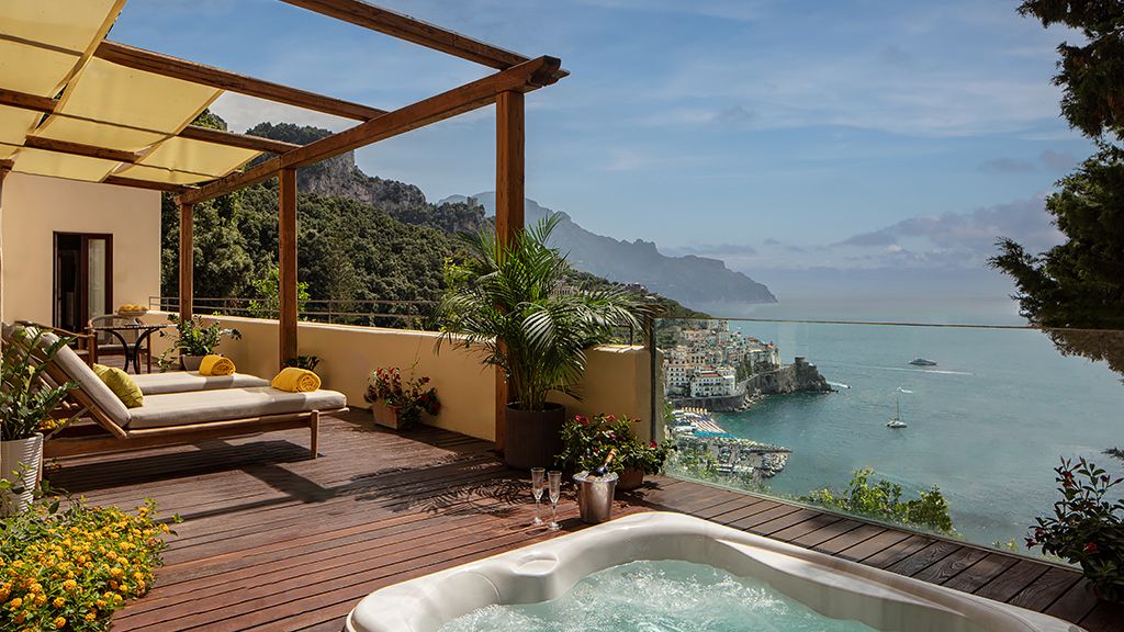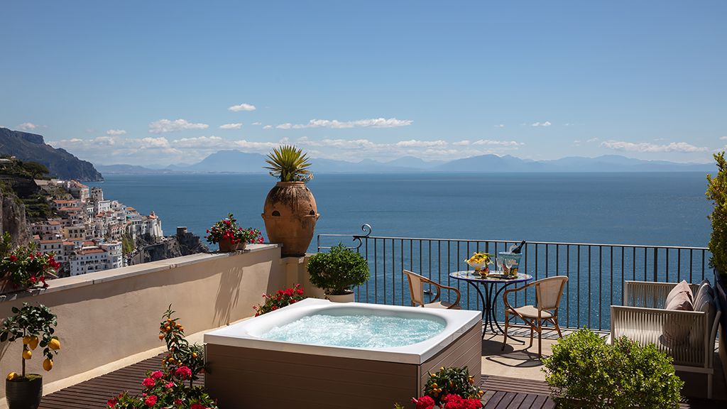 Suite dell’eremita sea view with terrace and jacuzzi. King bed. Free wi-fi. 85 sqm / 915 sqft eur200 credit per stay or convent tour with friar marcus. Free non-alcoholic minibar beverages. In-suite check-in / check-out. Ironing of 2 garments per day. Complimentary use of house car sea view. Jacuzzi with a view separate living room. Private terrace. Combined tub and rain shower.
