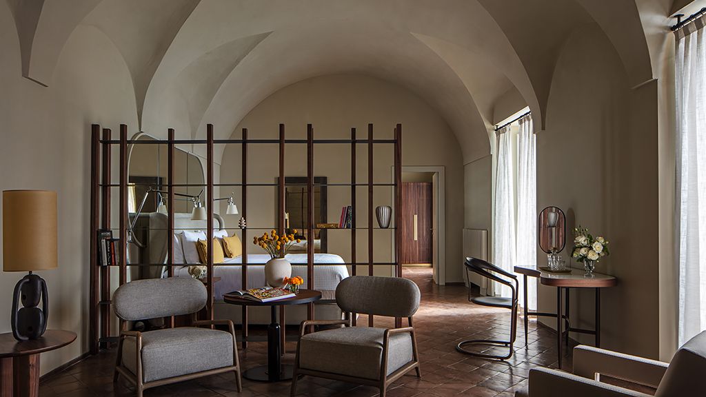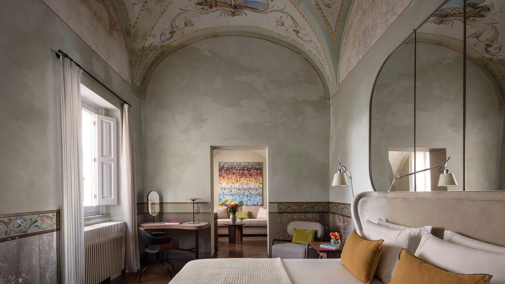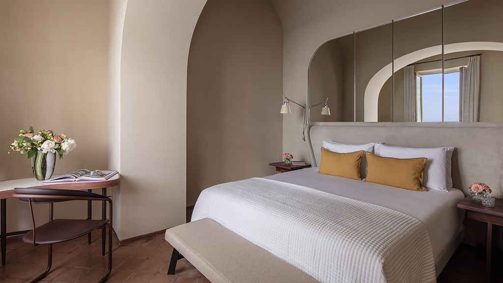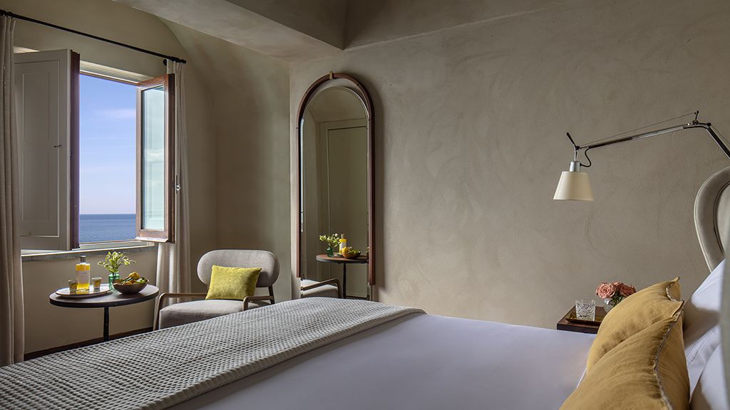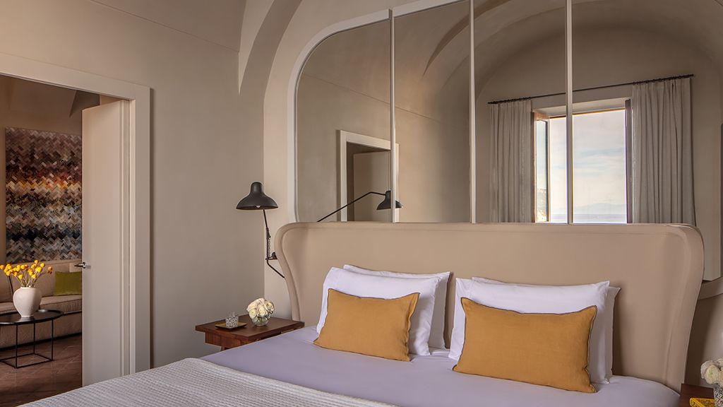 Suite del Priore. 35 sqm / 377 sqft. King bed + Sofa bed. Free Wi-Fi. Amaro Dei Cappuccini Tasting In-suite check-in / check-out Ironing of 2 garments per day Free non-alcoholic minibar beverages Complimentary use of house car for local drop-off Cloister and sea view Separate living room Sofa bed Luxury amenities.