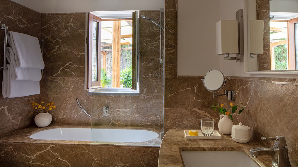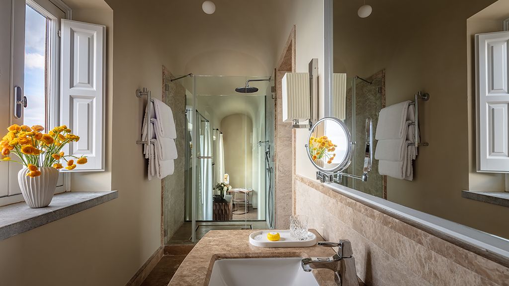 Suite sea view with terrace and jacuzzi 85 sqm / 915 sqft. King bed. Free wi-fi. Eur200 credit per stay or convent tour with friar marcus. Free non-alcoholic minibar beverages. In-suite check-in / check-out. Ironing of 2 garments per day. Complimentary use of house car. Sea view. Separate living room. Sofa bed . Luxury amenities. Separate tub and rain shower