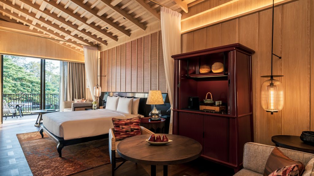 In this 50-square-meter room, enjoy tropical garden views and the extra sense of space that comes with a 4-meter-high sloped ceiling and an expansive 31-square-meter relaxation area. Room comforts include one king bed, a walk-in rain shower, bathtub and double vanity.