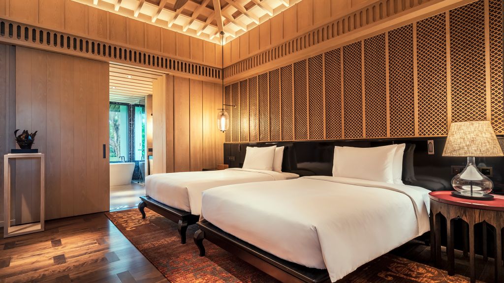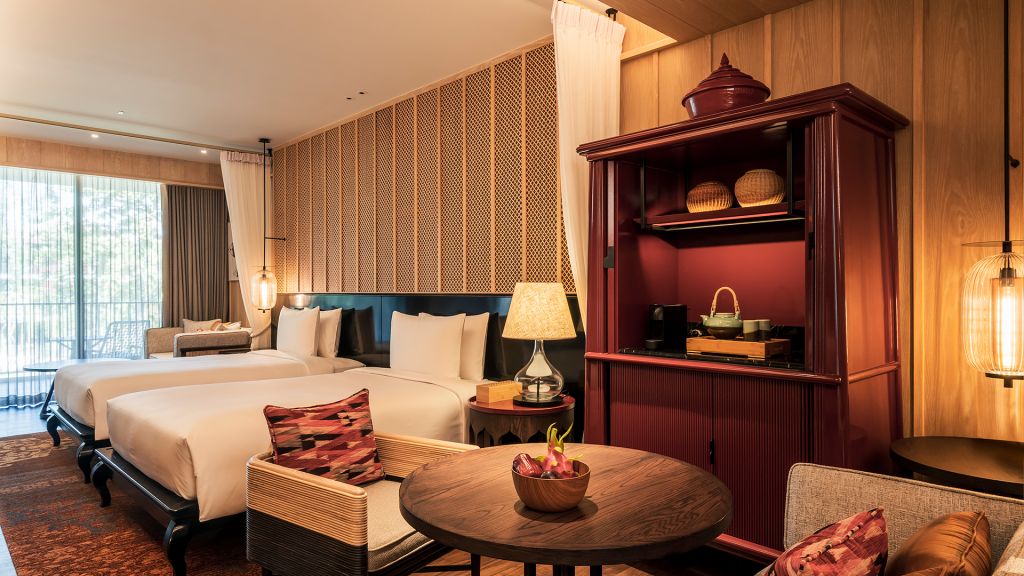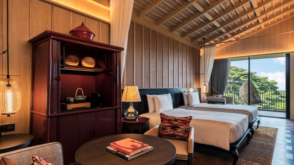 Delight in the tropical garden view from this 50-square-meter timber-floored room and an expansive 11-square-meter relaxation balcony featuring two twin beds, a luxurious bathroom with walk-in rain shower and bathtub, and a spacious balcony with a daybed.