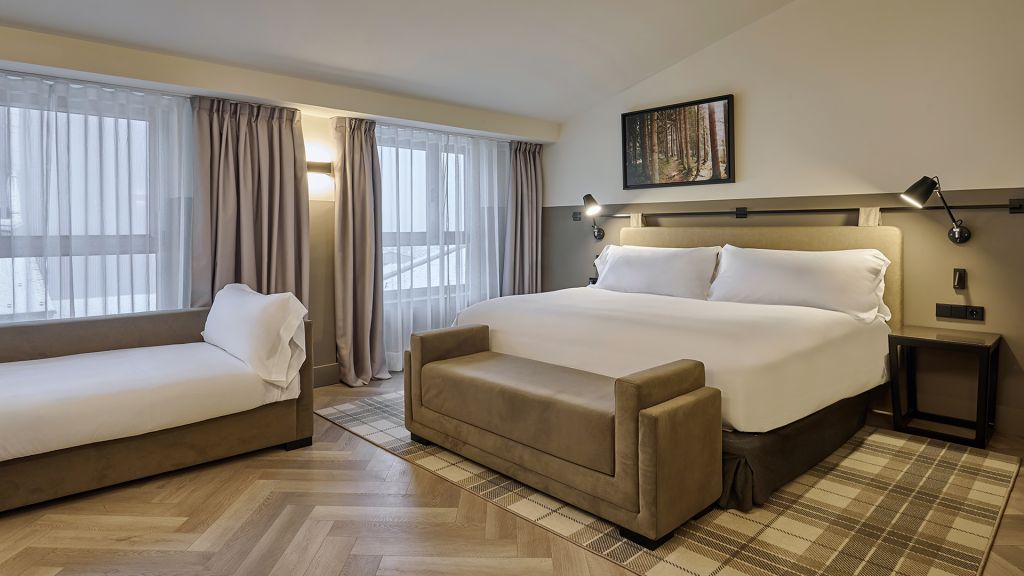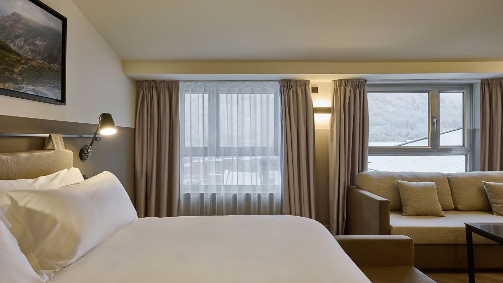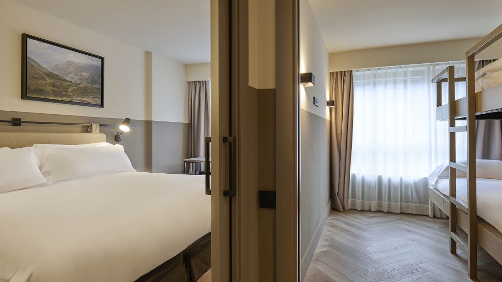 Our family room offers a spacious and inviting atmosphere for a memorable family stay. This room features a bedroom with either a king bed for the parents, alongside a second room with fun bunk beds for up to three children. With one ensuite bathroom, this is equipped with exclusive amenities and may include either a large walk-in shower or a comforting bathtub upon request, along with a single or double sink. Spanning 35 sqm (376 sqft), this comfortable retreat accommodates up to three adults, two children under 10 years old, and can include a baby cot available upon request. Enjoy exploring andorra city with your family from the comfort of your family room.