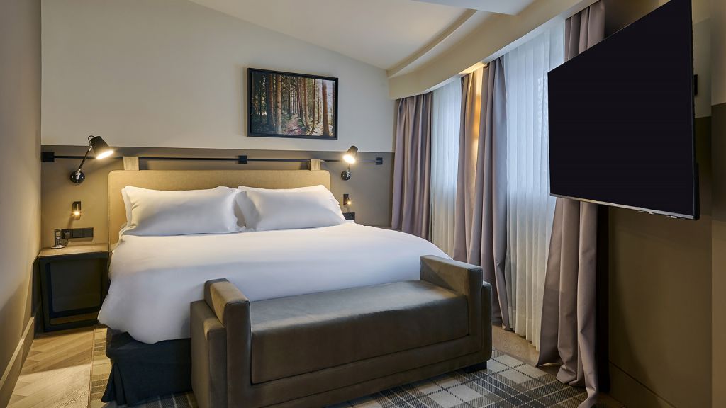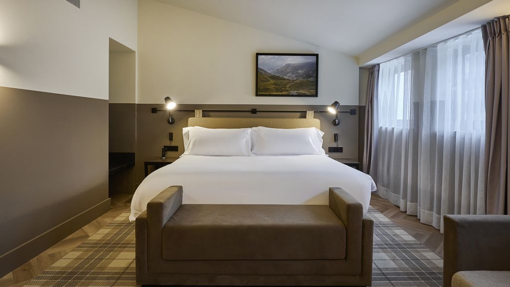 Our grand deluxe meritxell is an exceptionally spacious and thoughtfully designed room, offering beautiful views of avenue meritxell. It features a comfortable king or twin-sized bed, a cozy sofa for relaxation, and a desk area for those needing to catch up on work. The ensuite bathroom includes a spacious walk-in shower, a double sink, and exclusive amenities. Designed for both comfort and ease, it provides a relaxing space to recharge, complete with a nespresso machine for a warm cup of coffee. The room measures approximately 34 to 36 sqm (365 to 387 sqft) and can comfortably accommodate up to three guests, with a baby cot available upon request.