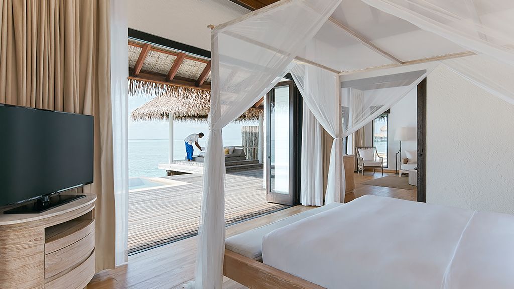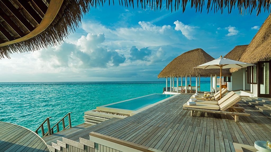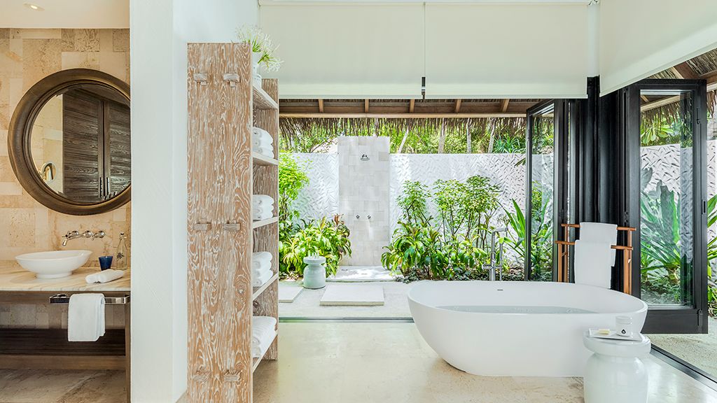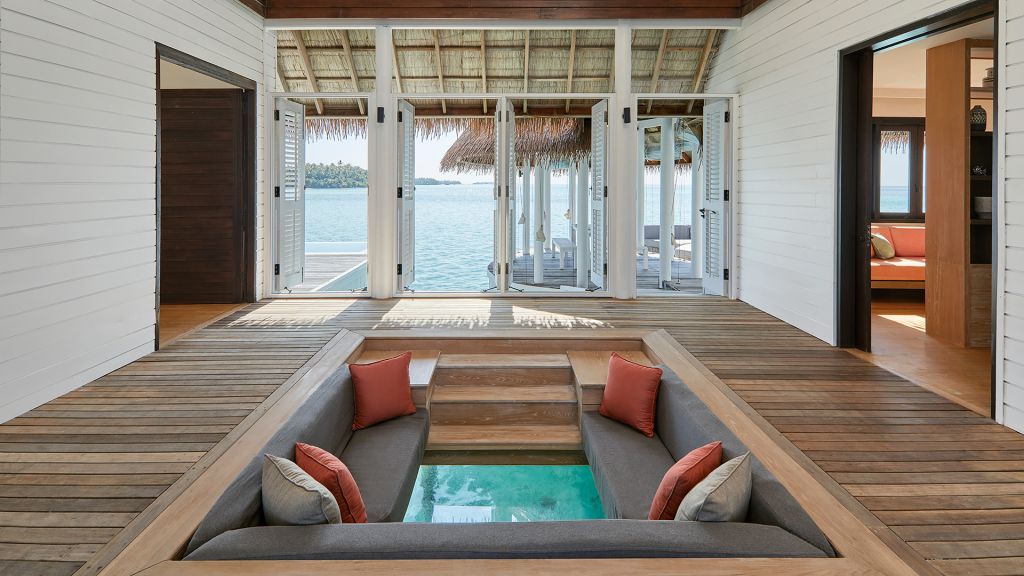 They feature a large bedroom with a living area and wide doors that open to a terrace with a plunge pool and direct access to the turquoise lagoon. The bathroom features a sunken bath and outdoor shower. key details panoramic sunrise view large living space direct ocean access private terrace with plunge pool sundeck with loungers, dining table and cabana one king bed sunken bath and outdoor shower the services of a shared butler (all suites and villas) sleeps three adults and one child