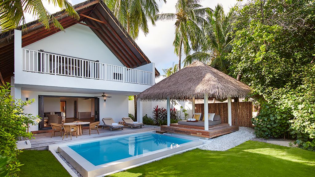 Our two-bedroom duplex beach house leads on to its own private lawn. Surrounding a large private pool is a secluded sundeck complete with sun loungers and furniture, allowing you to eat, drink and watch the sun rise and set from the comfort of your own space. key details duplex beach house with two bedrooms spacious living room private lawn large private pool secluded sundeck with loungers, dining table and cabana one king bed and two twin beds freestanding bathtub and separate shower stall direct beach access the services of a shared butler (all suites and villas) sleeps four adults, or three adults and one child
