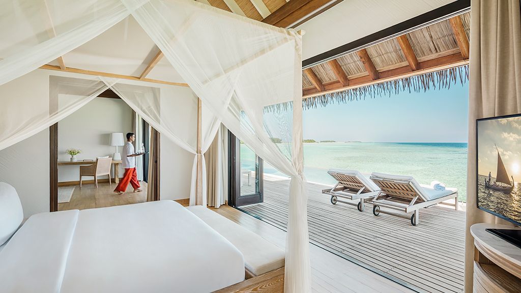 The bedroom has a separate dressing area and the bathroom features a sunken bath and outdoor shower. The large and airy sitting area can double up as a sleeping area for children. key details panoramic ocean views bedroom with separate dressing area spacious living room direct ocean access private pool and sundeck with loungers, dining table and cabana the services of a shared butler (all suites and villas) one king bed sunken bath and outdoor shower accommodates three adults and one child