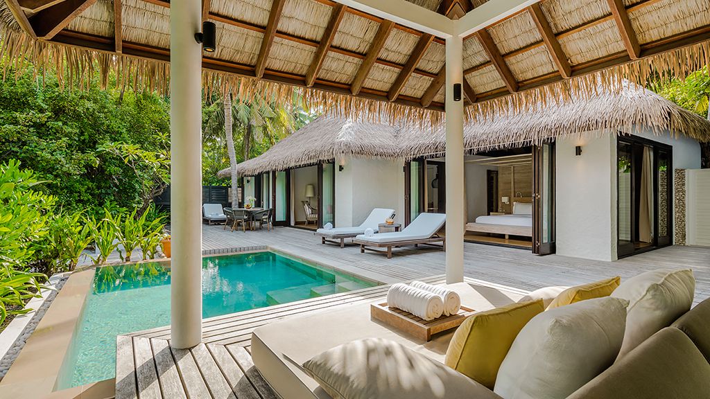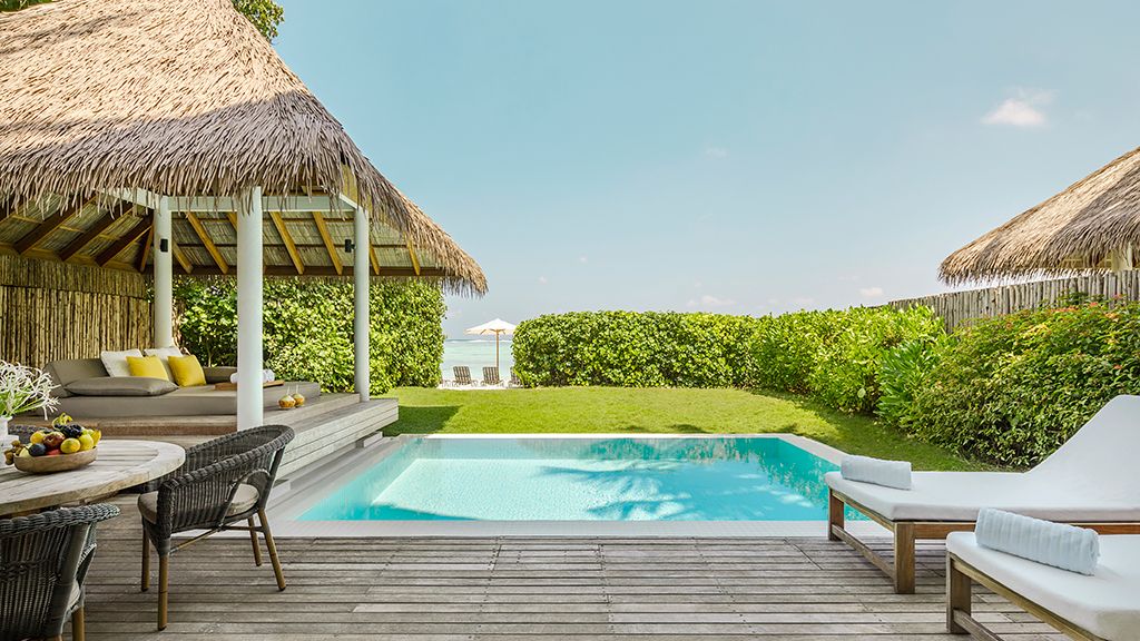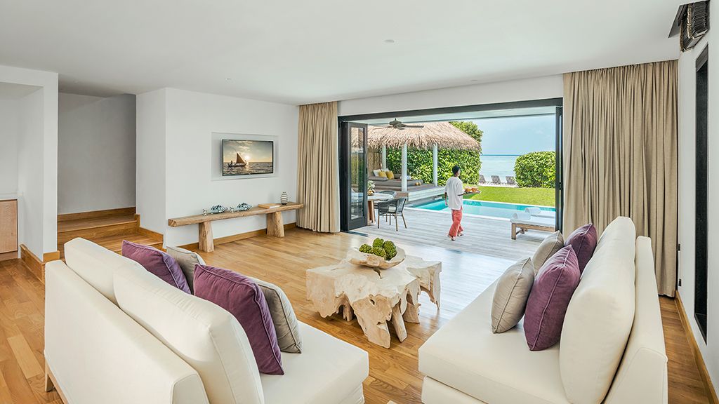 Made up of two sleek, comfortable bedrooms (both doubles), the accommodation offers sunrise views out over an endless ocean. It features a private lawn and swimming pool with space for al fresco dining and a full butler service. key details two double bedrooms spacious living room private lawn with pool outdoor shower with freestanding bathtub private services of a como butler panoramic sunrise view direct beach access sundeck with loungers, dining table and cabana sleeps four adults, or three adults and one child two king beds