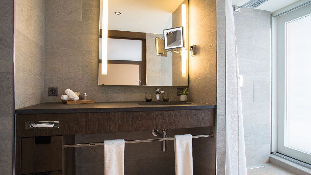 Crans Ambassador delivers a stirring first impression. Cradled in a dreamy mountain setting, the chalet appears as if suspended in mid air. Behind the iconic façade, styled to resemble the Swiss Alps, guests are beckoned into an elegant atmosphere with key notes of wood and stone throughout.