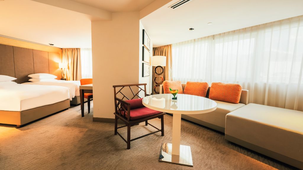 Recharge in the 645 sq ft (60 sq m) of living space featuring a separate bedroom with twin beds, a marble bathroom with a bathtub, and access to the Grand Club Lounge.