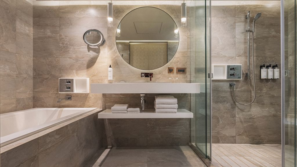 Relax in the 538 sq ft (50 sq m) sleeping area and living space, featuring a king bed, a modern marble bathroom, and advanced entertainment systems.