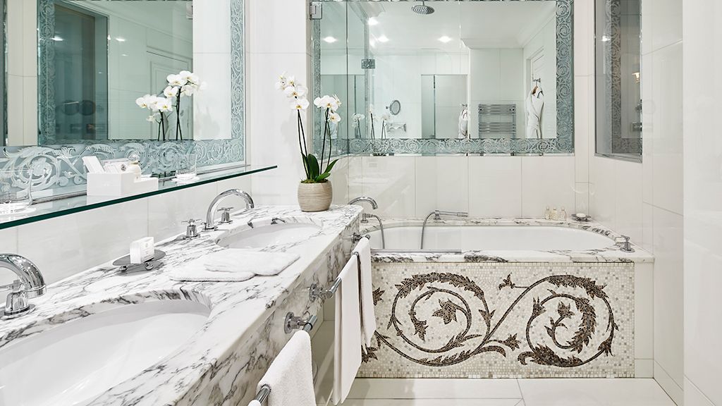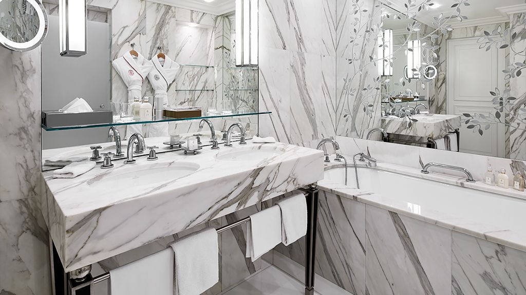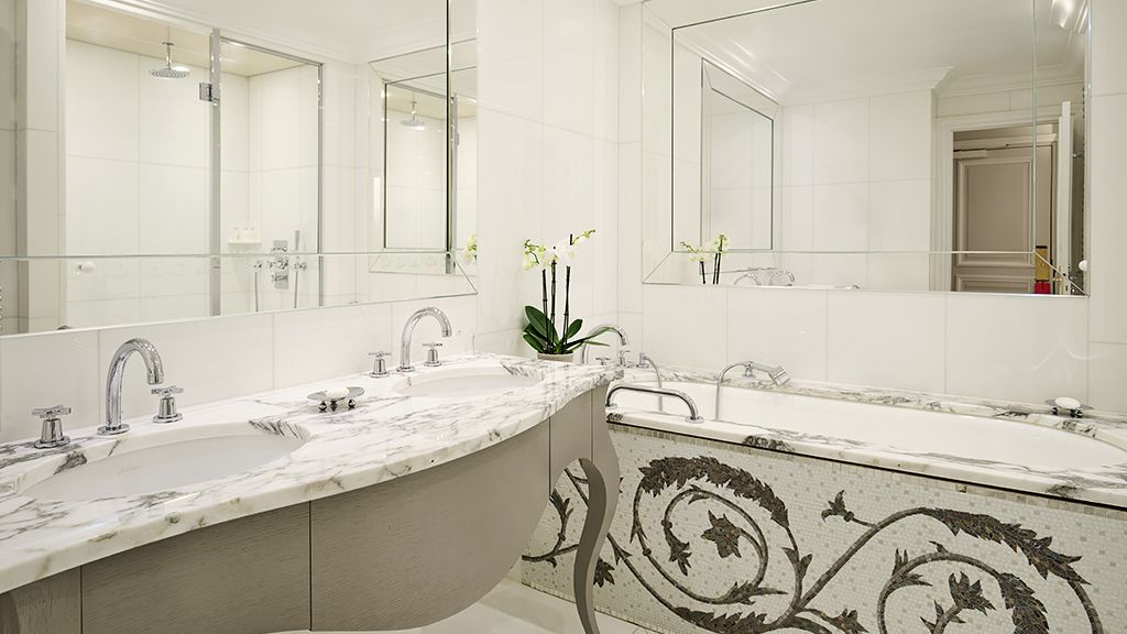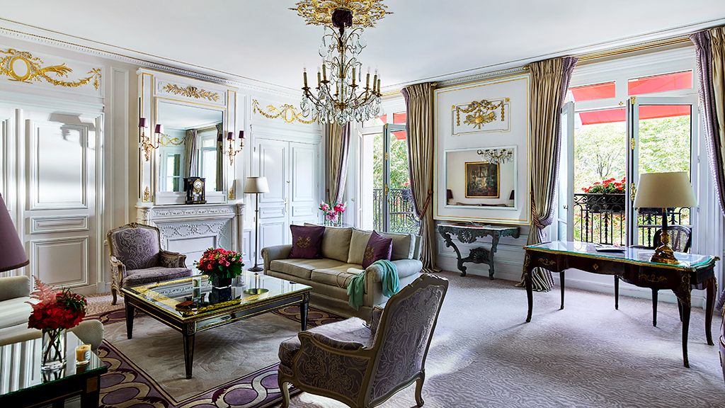 Prestige Suite with Avenue Montaigne and Eiffel Tower Views, balcony and marble bathrooms.