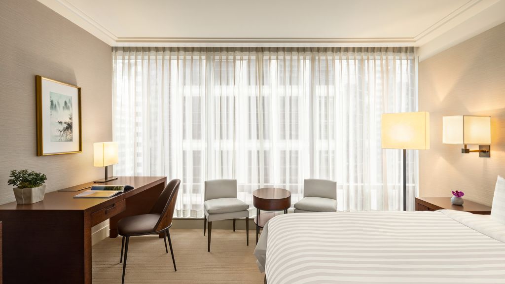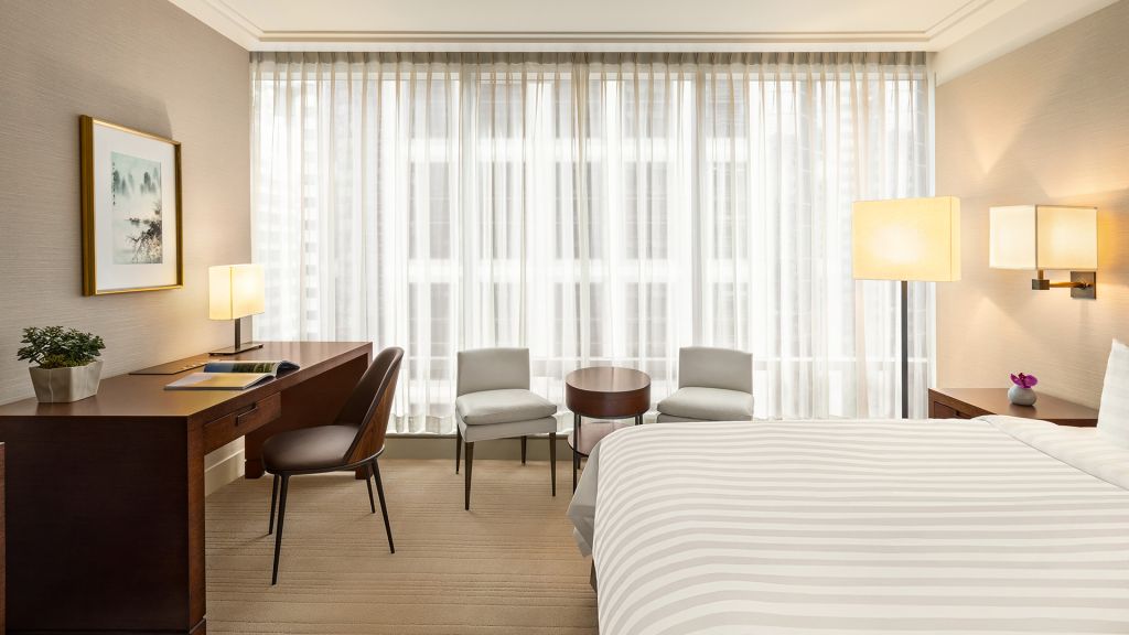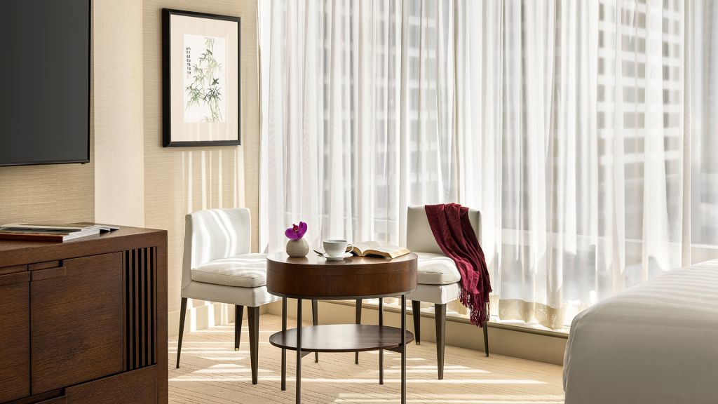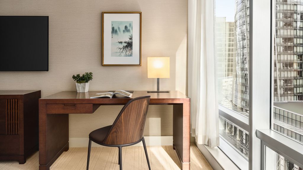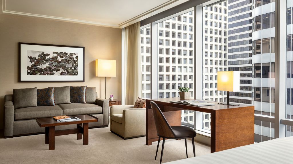 Take in the inspiring city view from this high-floor, 550 to 565-square-foot suite, with separate bedroom and living areas, a king bed and a spacious bathroom with a deep soaking tub, a walk-in shower and a mirror-embedded TV, plus a host of thoughtful amenities to make your stay comfortable.