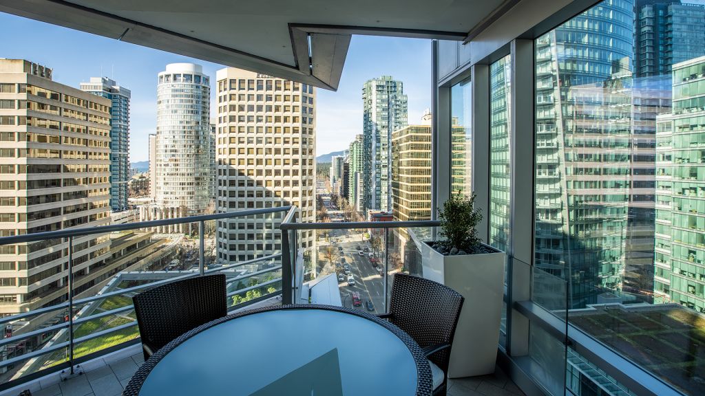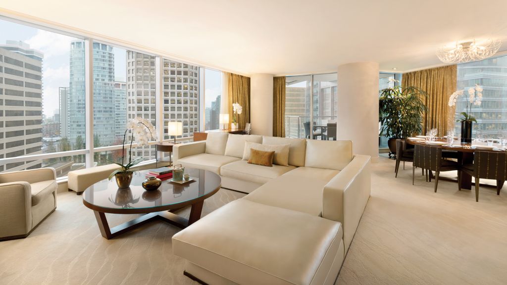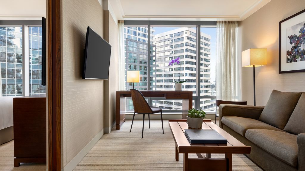 Gaze at downtown Vancouver through floor-to-ceiling windows from your 550- to 565-square-foot suite, with a bedroom featuring a king bed, a separate living area with a queen sleeper sofa and a spacious well-appointed marble bathroom with a deep soaking tub, a walk-in shower and a mirror-embedded TV.