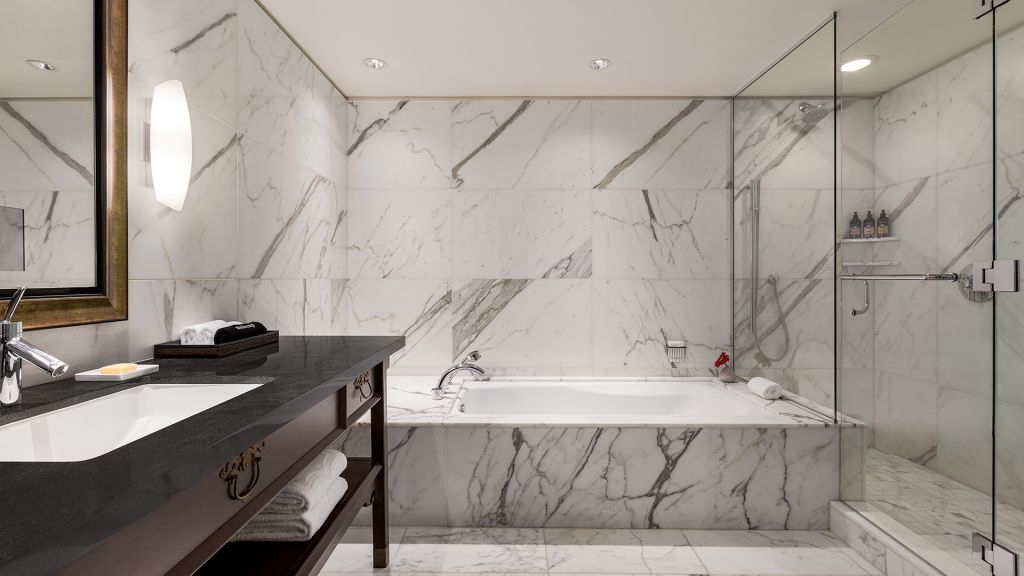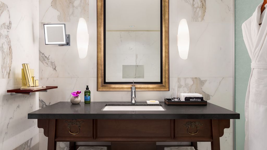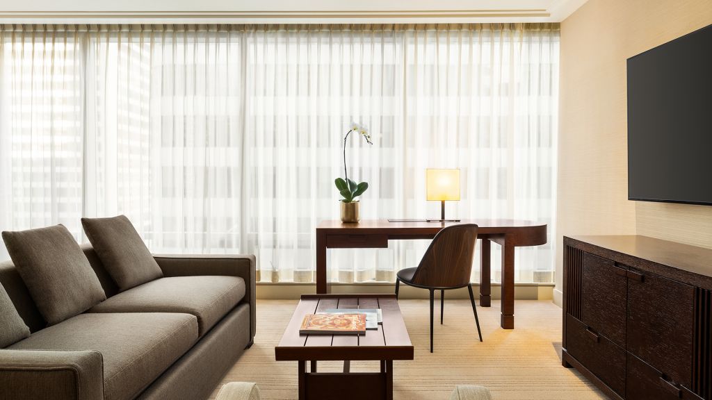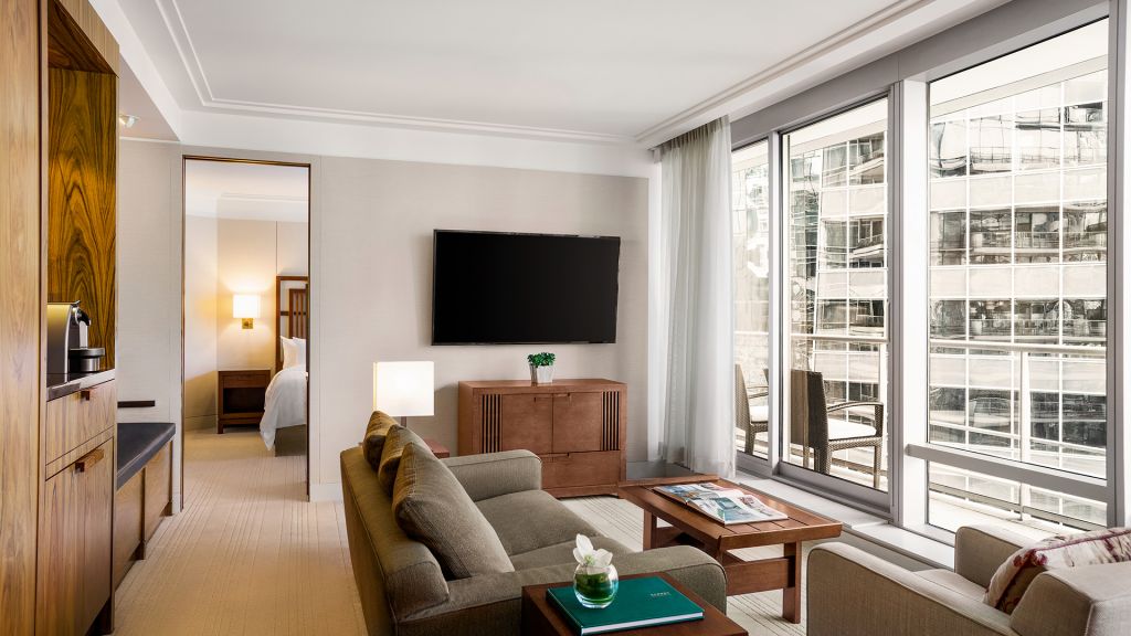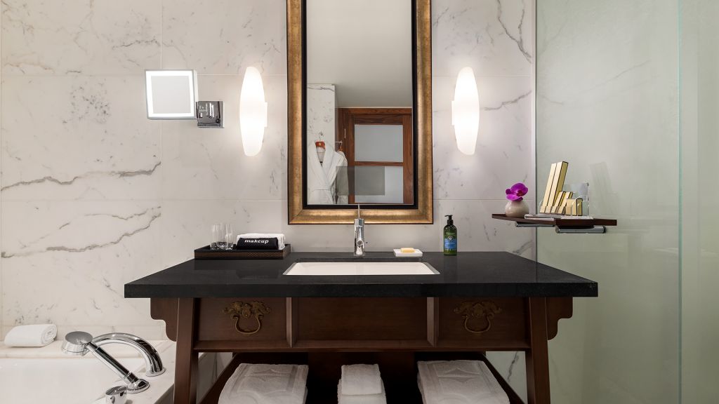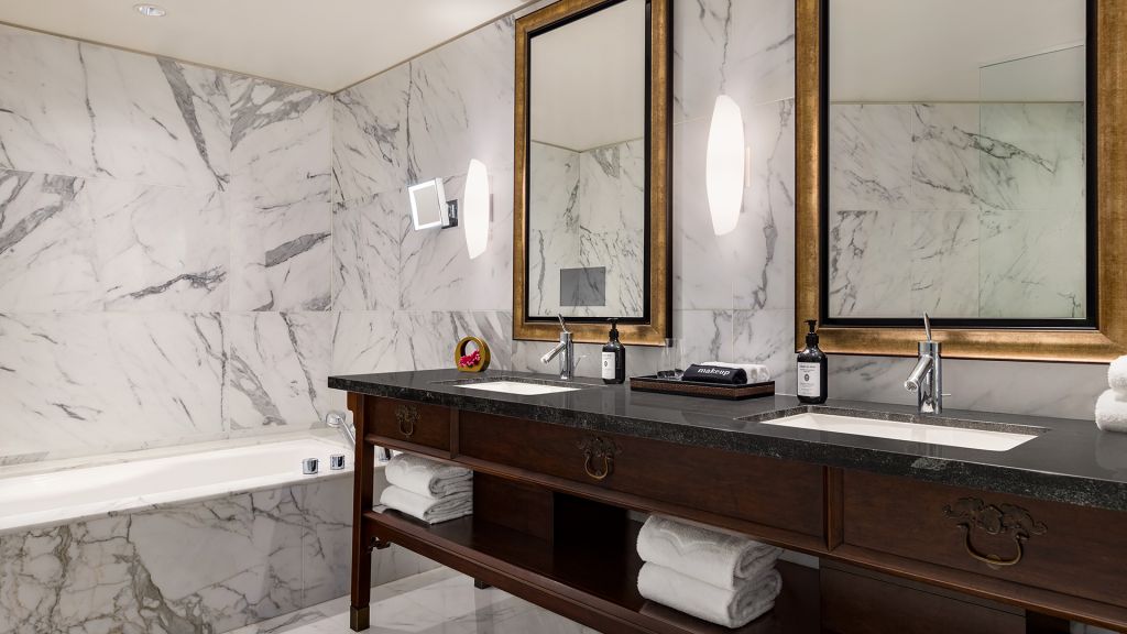 Take in views of the city from your 1,395-square-foot residential-style suite, complete with a separate kitchen, large dining and living areas, a generous balcony, a separate bedroom with a four-poster king bed, a walk-in dressing room, a powder room and a spacious bathroom with a deep soaking tub, a steam shower and a mirror-embedded TV.