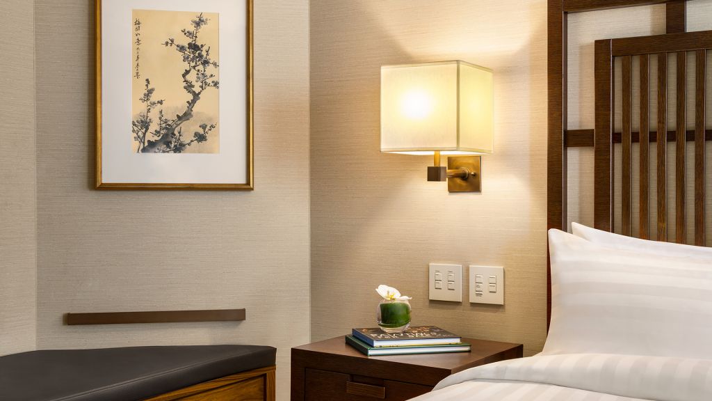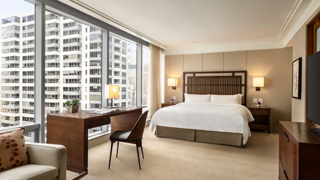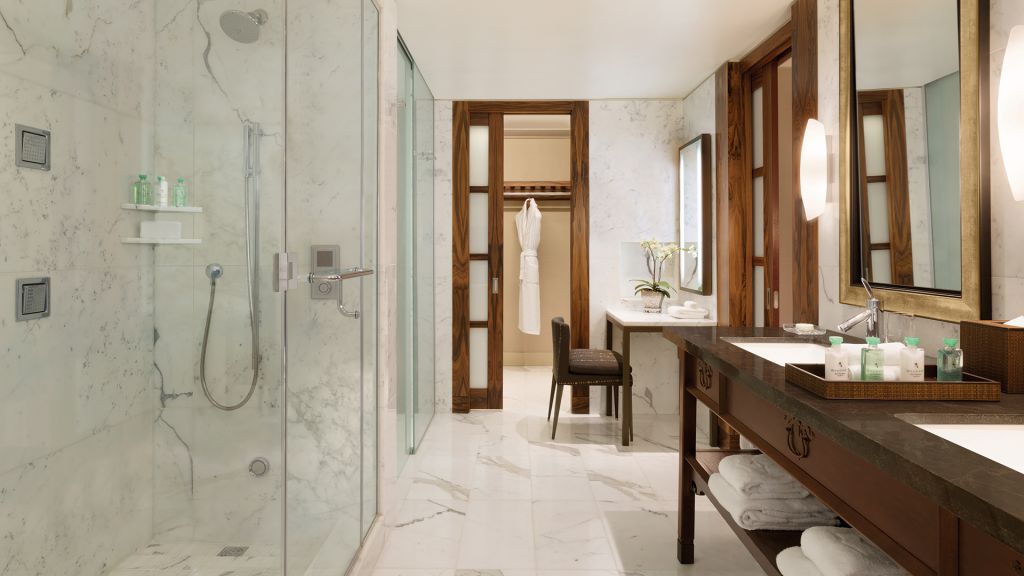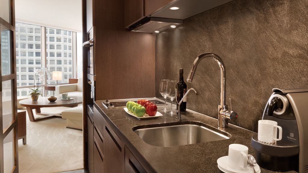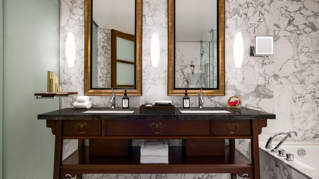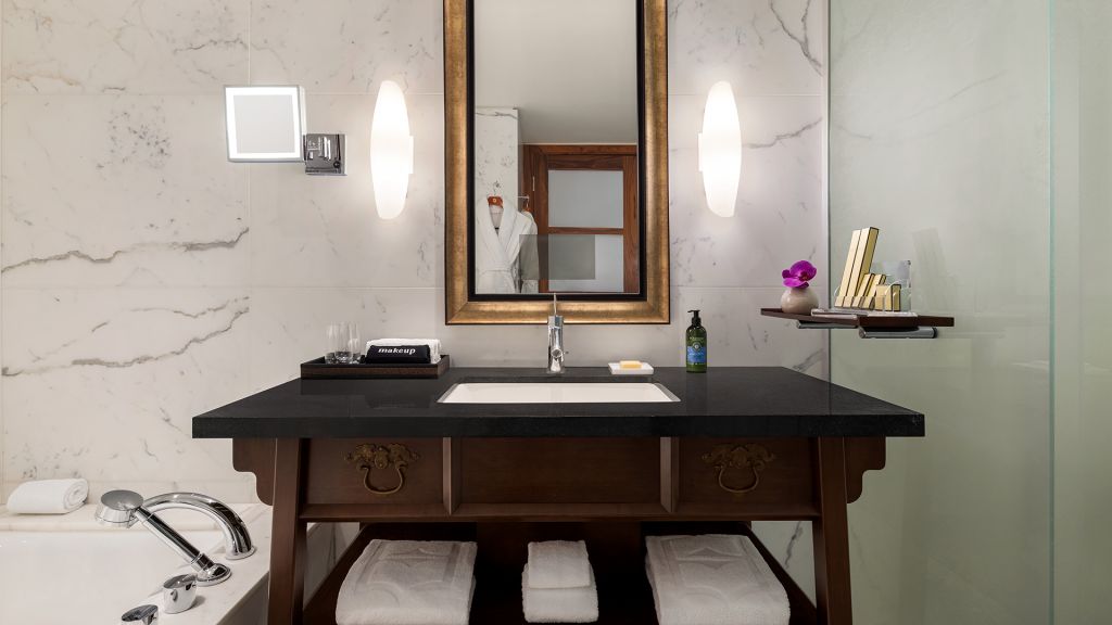 Take in views of the city from your 1,395-square-foot residential-style suite, complete with a separate kitchen, large dining and living areas, a generous balcony, a separate bedroom with a four-poster king bed, a walk-in dressing room, a powder room and a spacious bathroom with a deep soaking tub, a steam shower and a mirror-embedded TV.
