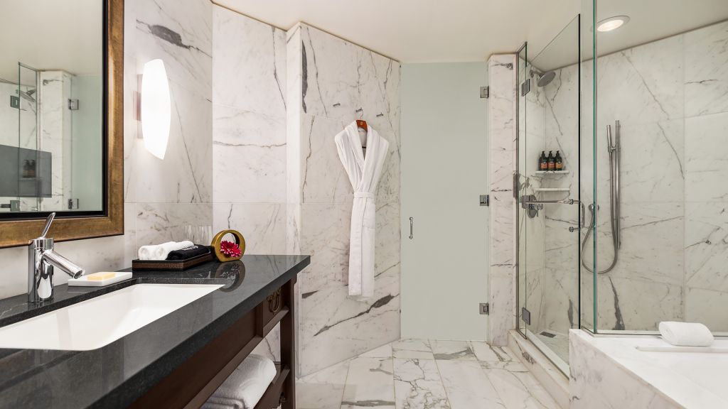 Settle into your spacious, 505- to 625-square-foot room, complete with a king bed, a separate seating area with a sleeper sofa, a marble-clad bathroom with a walk-in shower and soaking tub, and floor-to-ceiling windows that open to coastal breezes.