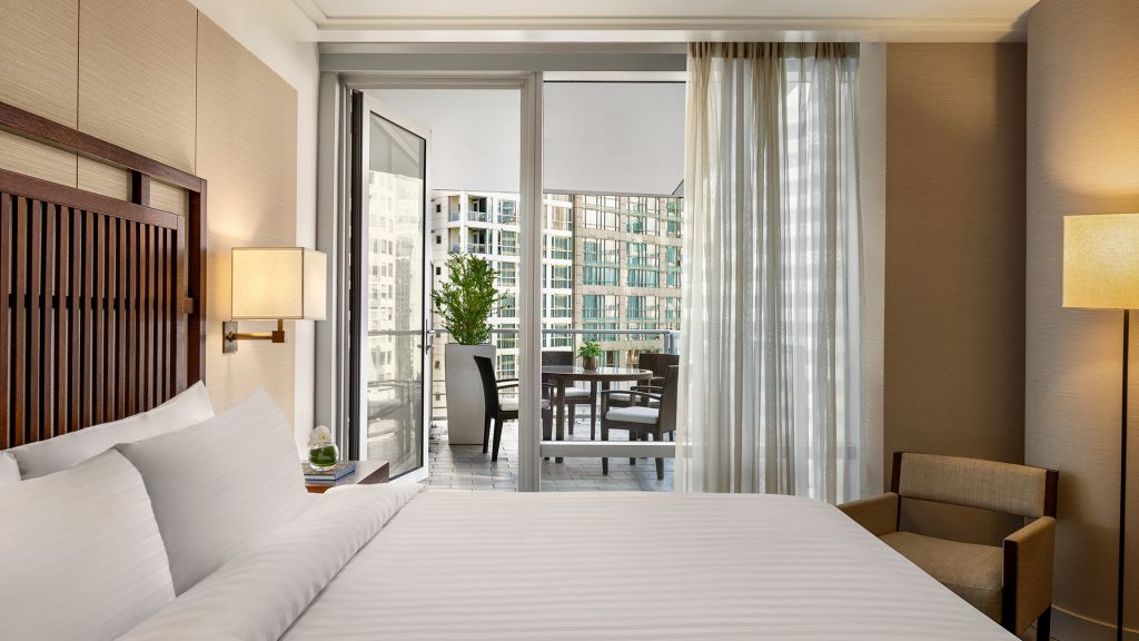Stay in downtown style in a 680- to 695-square-foot suite with your own private balcony, a king bed, a separate living area and a large marble bathroom outfitted with a deep soaking tub, a walk-in shower and a mirror-embedded TV.