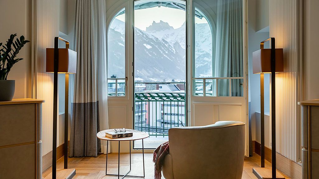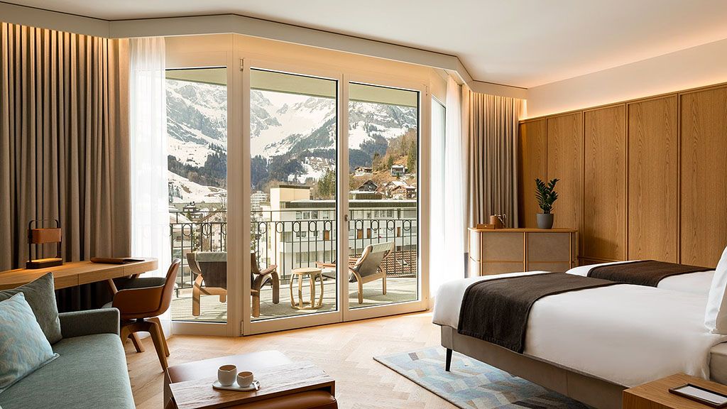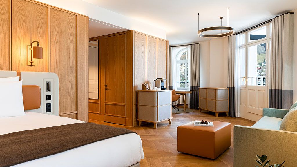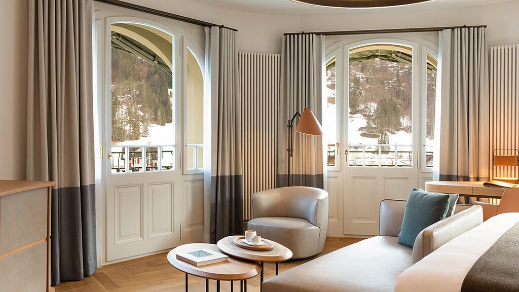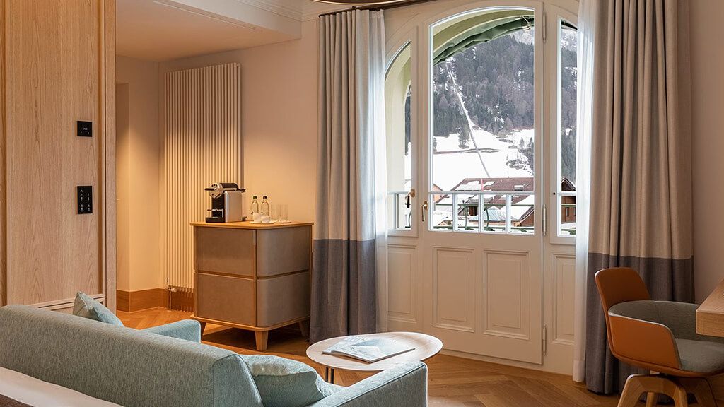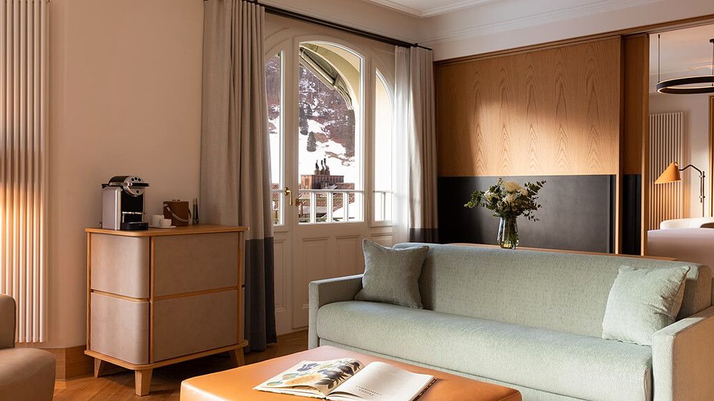 Titlis suite - 1 king bed. Located on the top floor this unique junior suite offers panoramic views to mount titlis and the surrounding mountains. Based in the belle epoque wing combining historic details with modern interior design and functionality. Spacious room with living area and private terrace. Complimentary wi-fi, flat screen tv including mobile mirroring, coffee and tea making facilities. Bathroom with a walk-in rain shower. Maximum occupancy: 4 persons (including toddlers and infants). Room size 55 sqm.