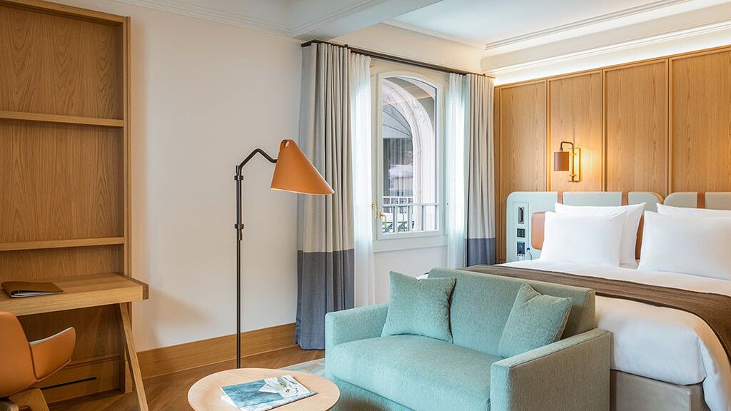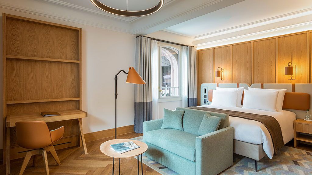 Superior room - 1 king bed or 2 twin beds. Mountain view. Located in the belle epoque wing combining historic details with modern interior design and functionality. Some rooms have a balcony. Complimentary wi-fi, flat screen tv including mobile mirroring, coffee and tea making facilities. Bathroom with a walk-in rain shower. Maximum occupancy: 2 persons (including toddlers and infants). Room size 30 - 38 sqm.