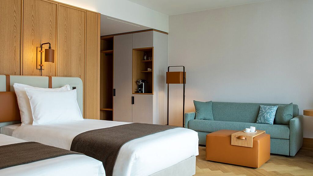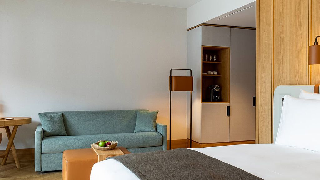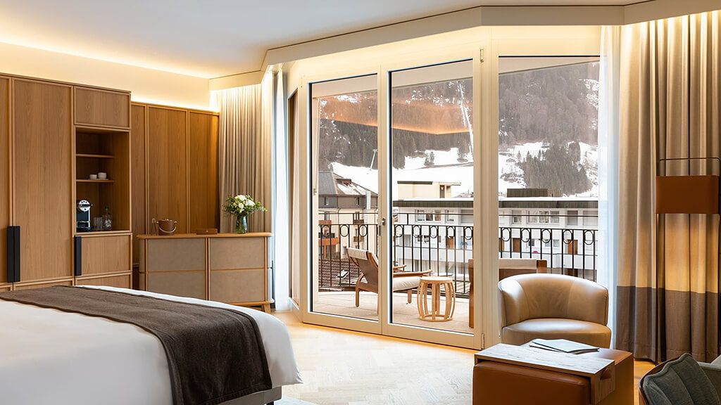 Junior suite - 1 king or 2 twin beds. Magnificent views to the surrounding mountains. Spacious rooms with seating area and balcony. Located in the new wing showcasing state of the art interior design and functionality. Sofabed, complimentary wi-fi, flat screen tv including mobile mirroring, coffee and tea making facilities. Bathroom with a separate bathtub and a walk-in rain shower. Maximum occupancy: 4 persons (including toddlers and infants). Room size 52 - 55 sqm.