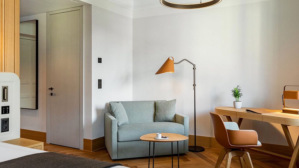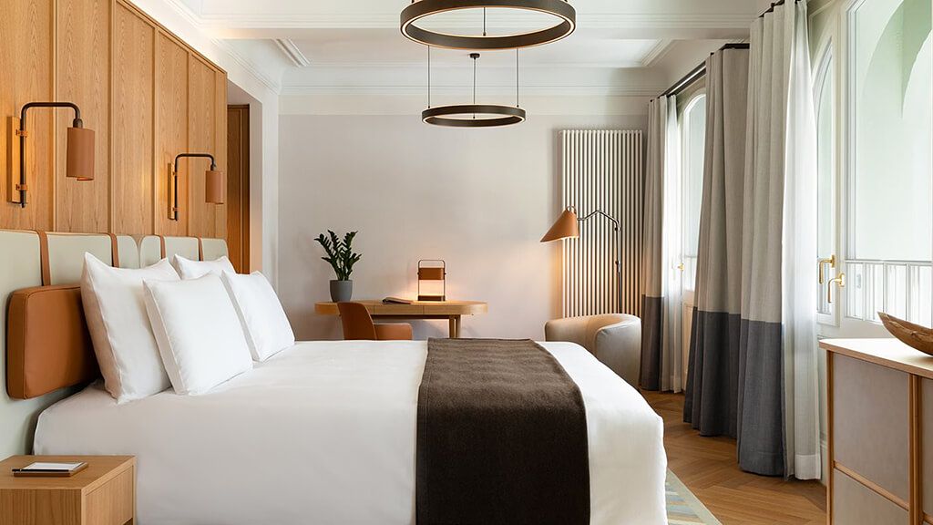 Boutique room - 1 king bed. Mountain view. Located in the belle epoque wing combining historic details with modern interior design and functionality. Complimentary wi-fi, flat screen tv including mobile mirroring, coffee and tea making facilities. Bathroom with a walk-in rain shower. Maximum occupancy: 2 persons (including toddlers and infants). Room size 25 - 29 sqm.