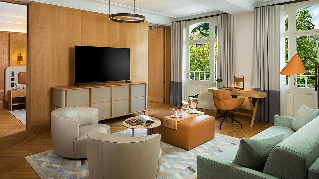 Park suite - 1 king or 2 twin beds. Views to the surrounding mountains. Spacious suite located in the belle epoque wing combining historic details with modern interior design and functionality. Separate living and bedroom with balcony, sofa bed, complimentary wi-fi, flat screen tv including mobile mirroring, coffee and tea making facilities. Connecting suite available on request and upon availability. Bathroom with a separate bathtub and a walk-in rain shower. Maximum occupancy: 4 persons (including toddlers and infants). Room size 68 sqm.