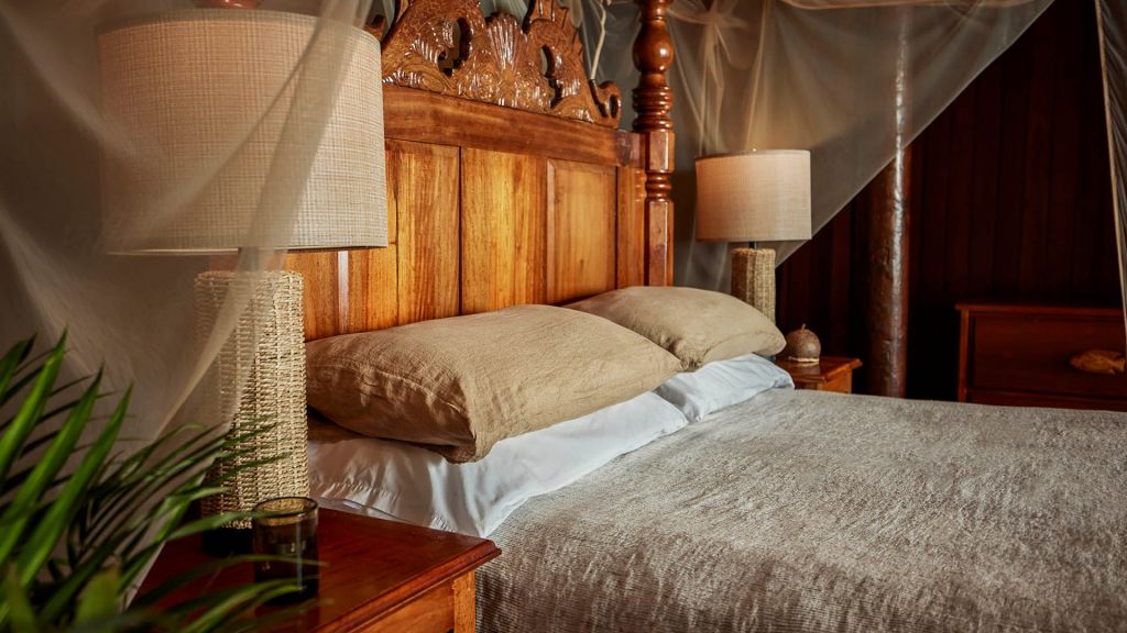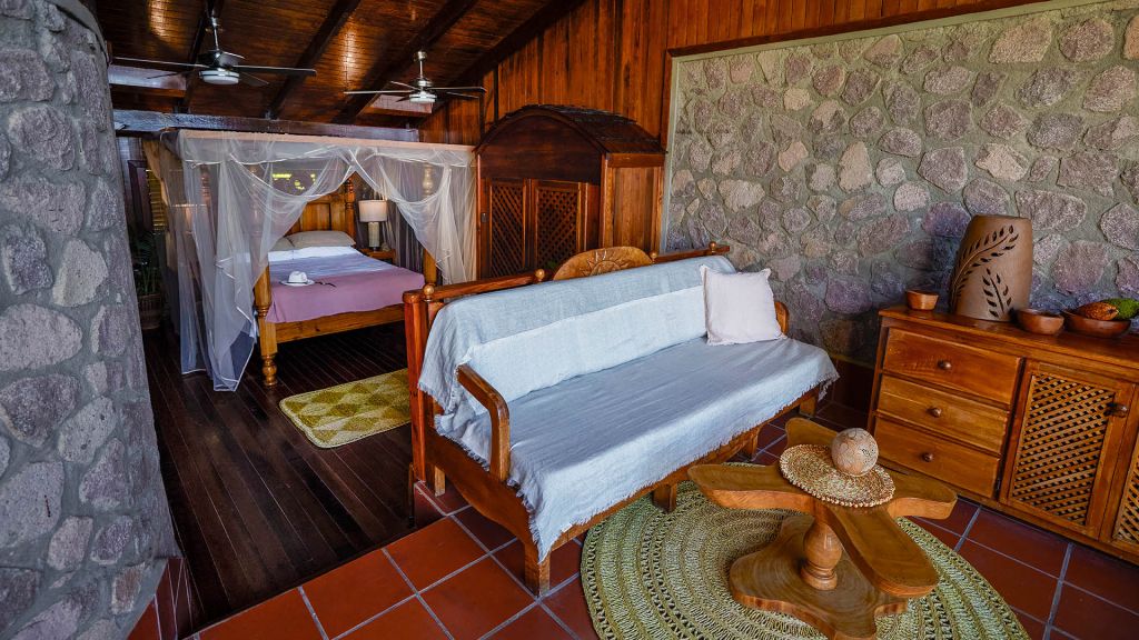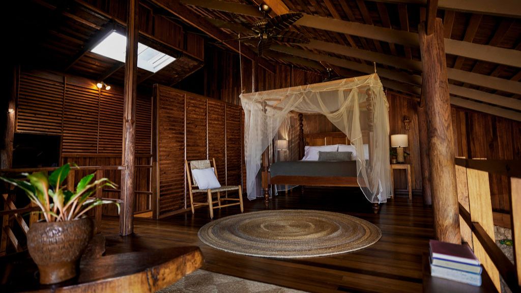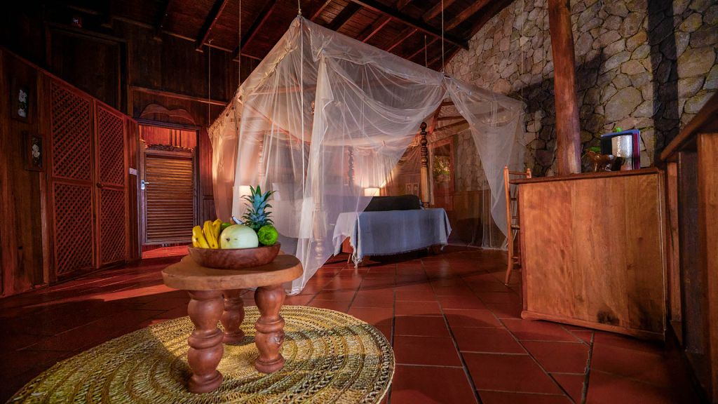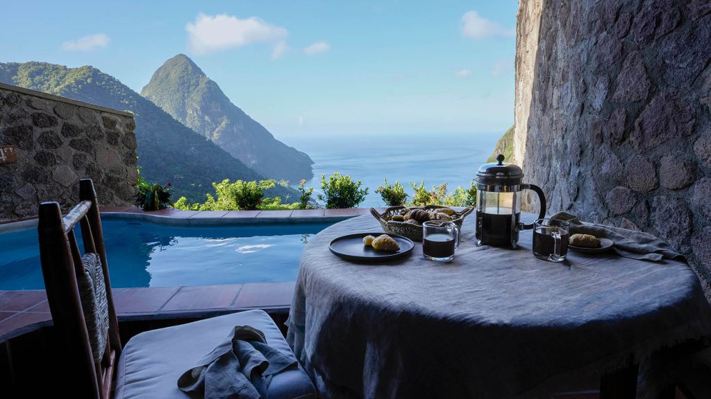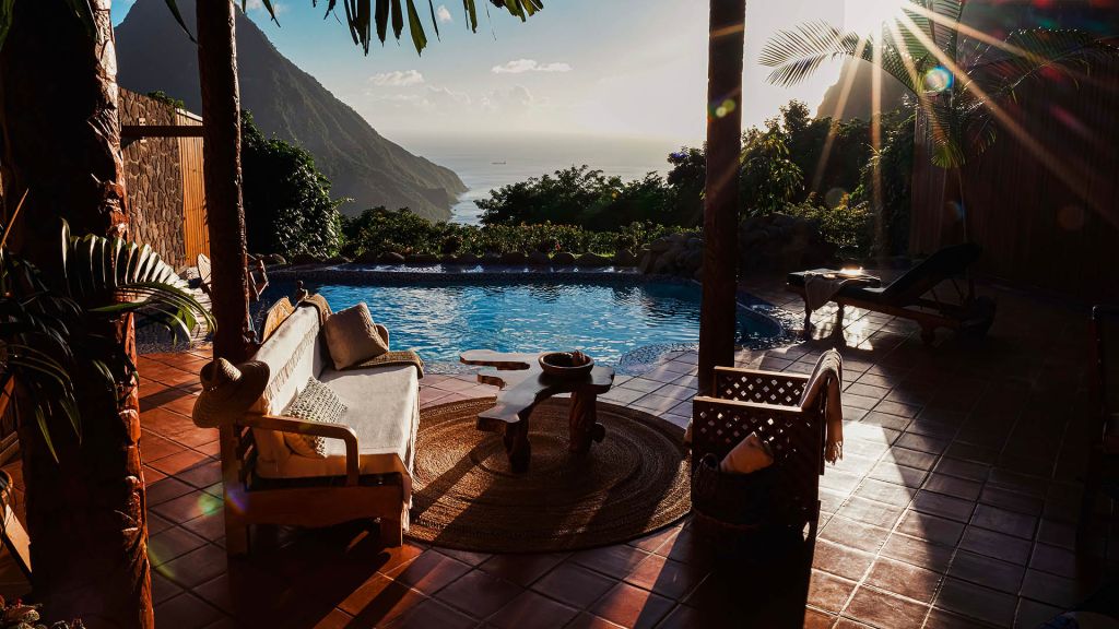 Nothing prepares you for the view of the forested Piton mountains rising from the blue Caribbean - let alone the fact that your Hilltop Dream Suite has no living-room wall. Sliding into the heated pool as warm trade winds buffet the canopy of your four-poster bed, you're in total privacy here at Ladera. Because the suite stands on a ridge high above the ocean, no one can see in but the passing birds.