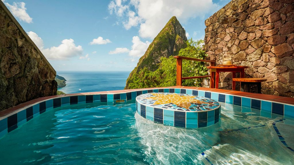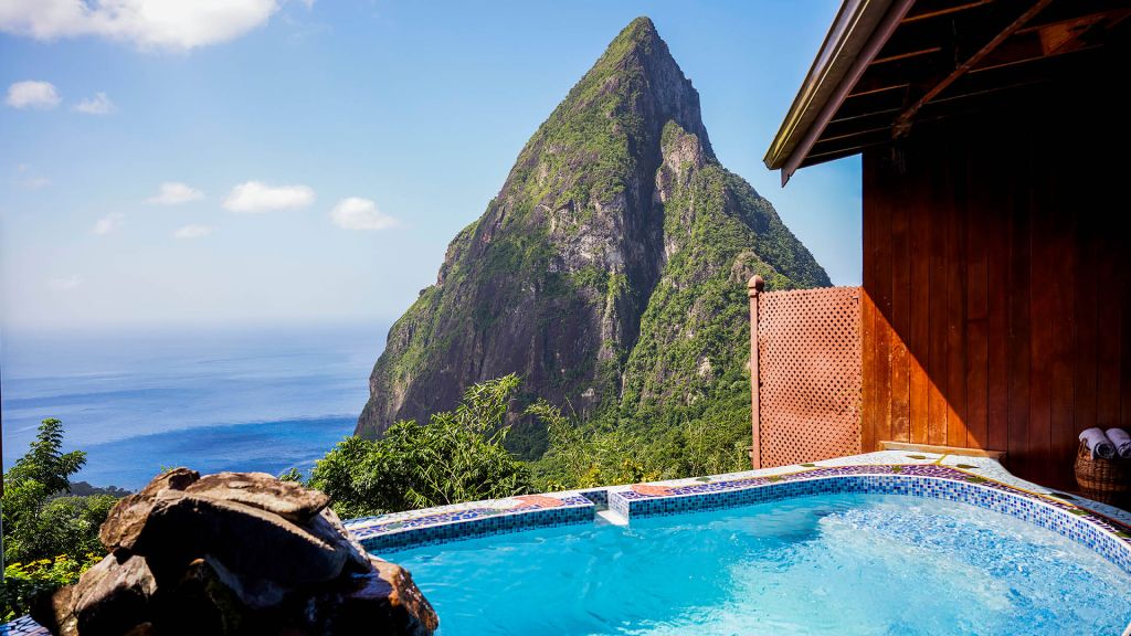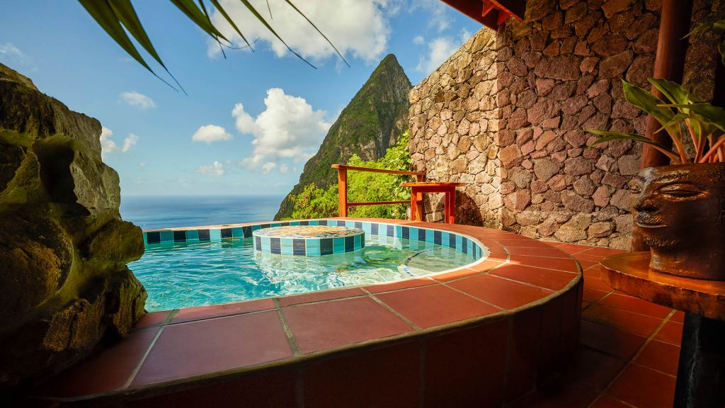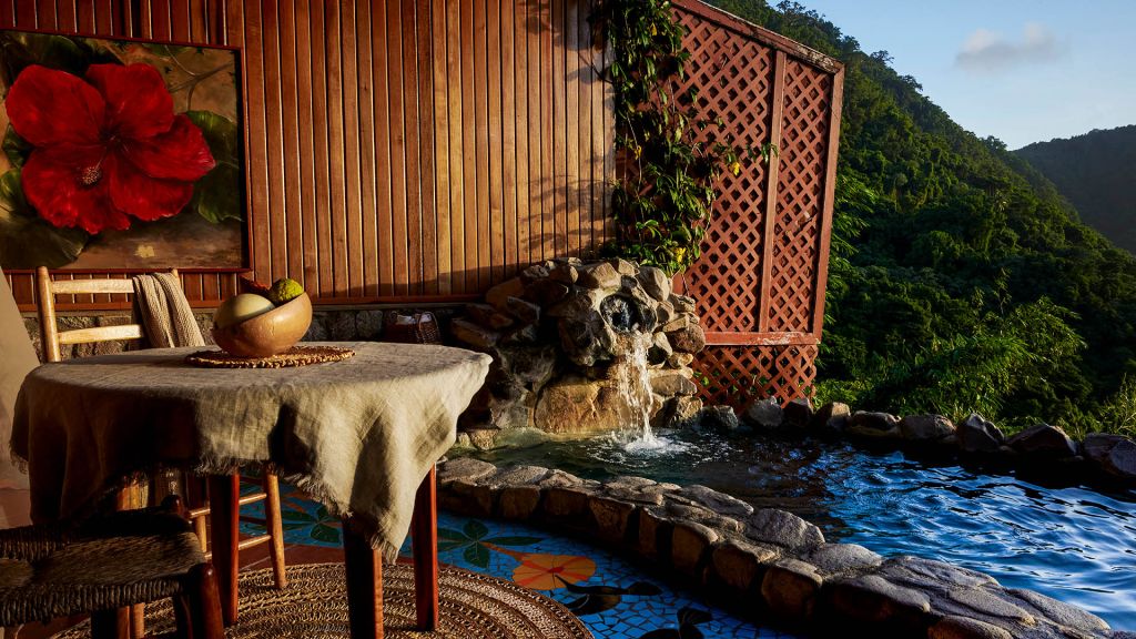 Features a queen bed, open wall, Piton views, and heated plunge pool. Includes breakfast and airport transfers.
