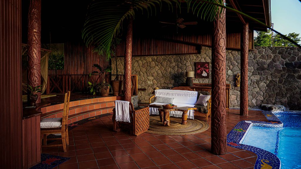 Features a king bed, open wall, heated pool, swing, and lounge chair. Includes breakfast and airport transfers.