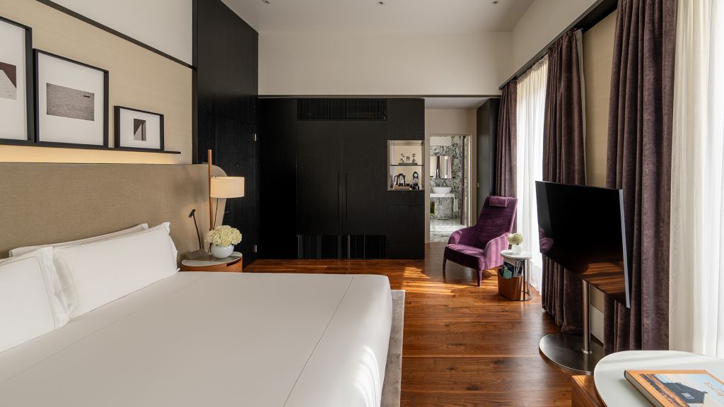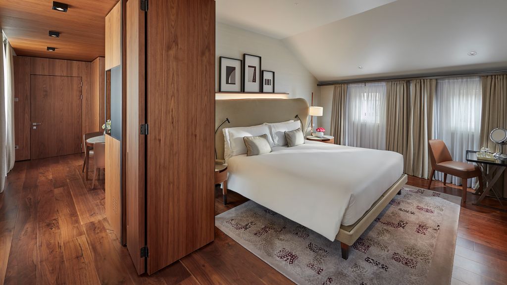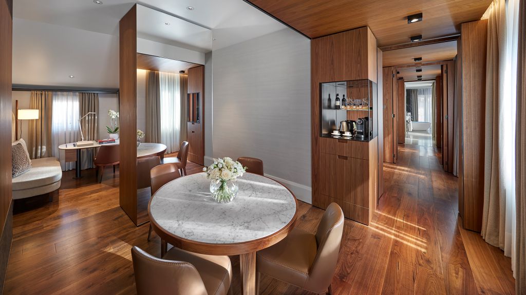 Elegantly appointed with custom-designed furniture, walnut wardrobes and wooden floors, these spacious connecting suites feature two large bedrooms. Adjoining these is a spacious living room, offering space in which to relax and entertain.