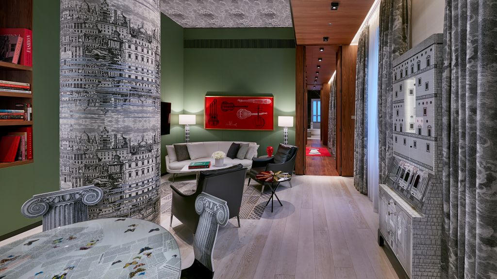 The presidential suite connects to our fornasetti suite, creating a perfect ambience. This magnificent three-bedroom connecting suite offers unique luxury, features a four-poster bed, showpiece bathrooms and original fornasetti furnishings.