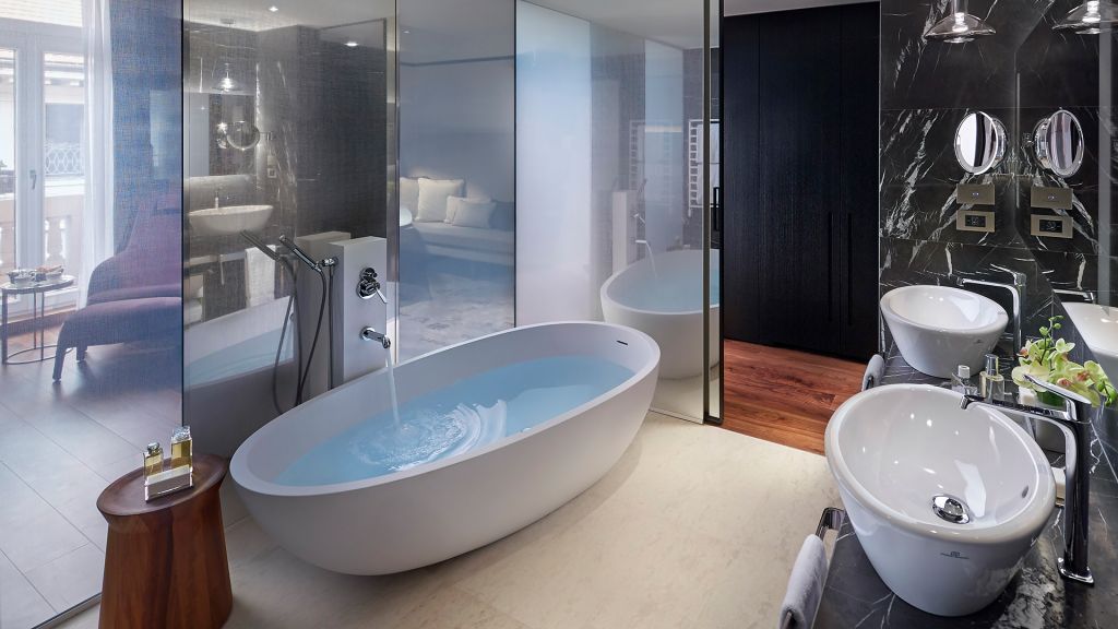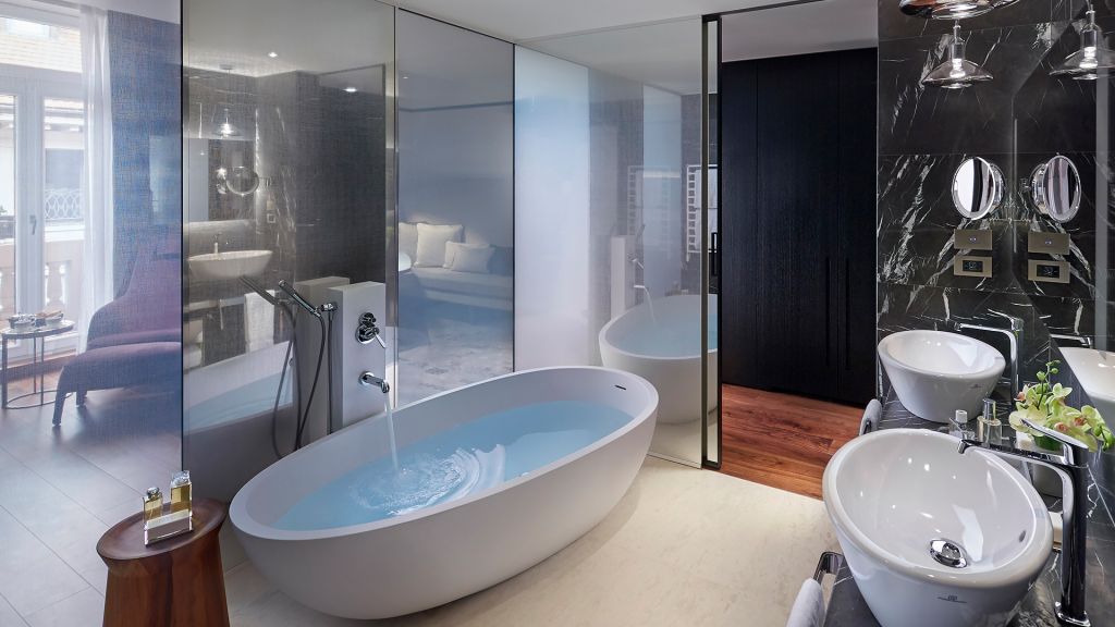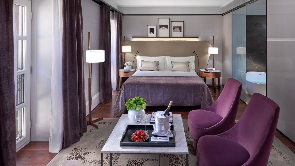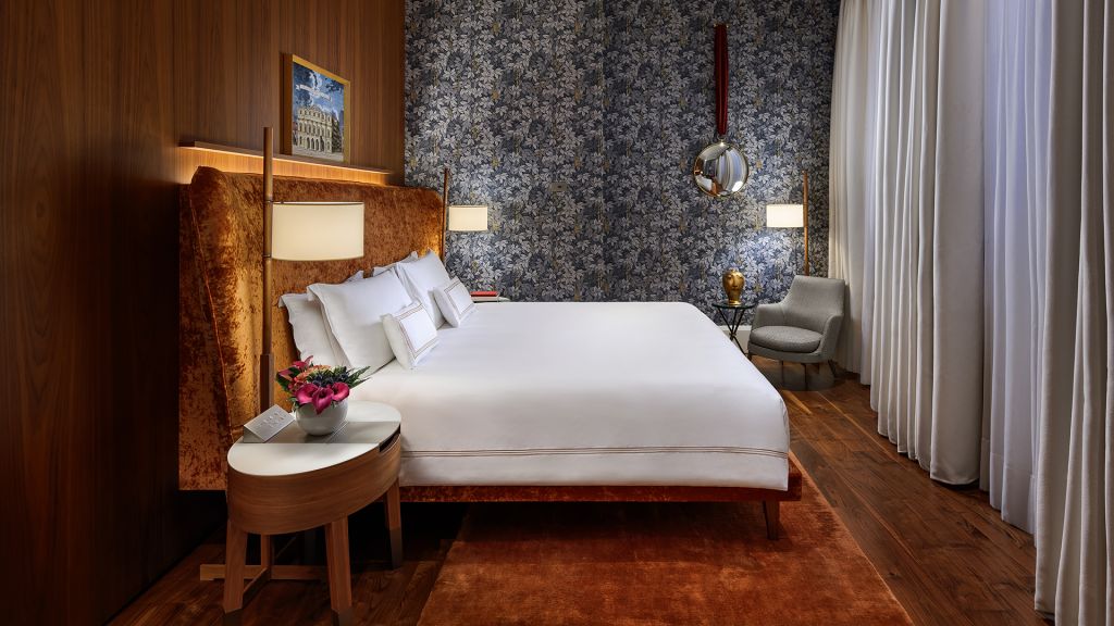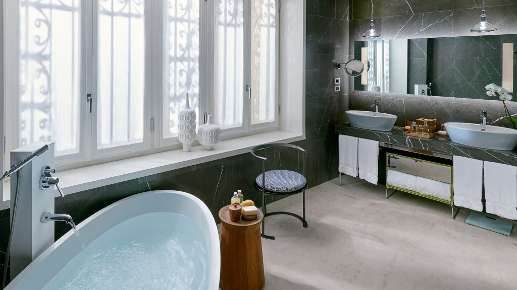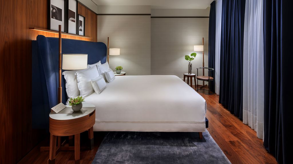 Designed in tribute to the style of designer giò ponti, this suite consists of a living area, bedroom, and guest bathroom. Collectable pieces are seen throughout the suite, which also boasts an agape bath and walk-in shower.