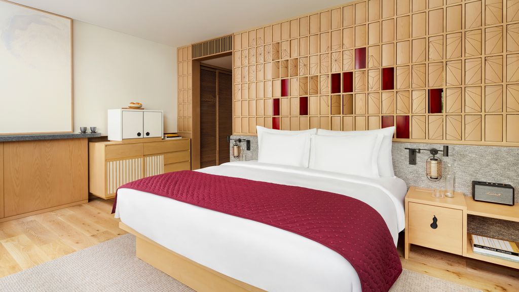 A beautifully integrated sleeping space designed in a contemporary style and leading to a balcony. Our Deluxe King rooms blend a contemporary style with traditional Japanese influences, with natural materials incorporated throughout. Each room has large windows to maximize the feeling of space, light, and connection to the surroundings, and leads to a balcony for an indoor-outdoor flow and extra fresh air. Maximum occupancy: 3.