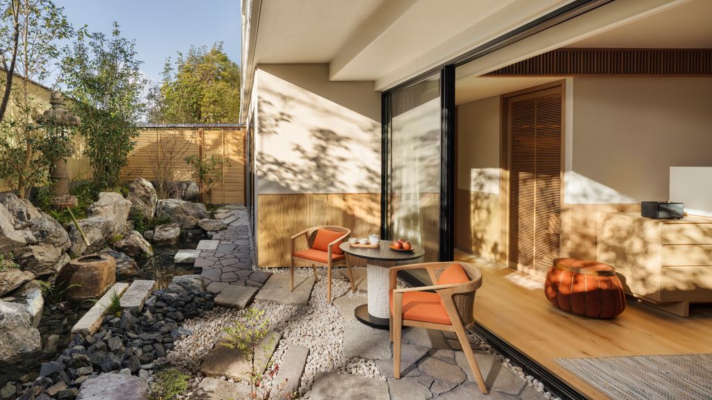 A modern Japanese-inspired zen sanctuary offering calming sight of the Japanese inner courtyard from the balcony. This peaceful garden room invites you to a modern Zen sanctuary. With a spacious balcony facing the serene inner courtyard, guests can enjoy the soothing sounds of birdsong and the calming sight of the inner courtyard garden, complete with flowing streams and Japanese pine trees. The Deluxe Garden King features a spacious bedroom with a living area in elegant modern Japanese design touches. Maximum occupancy: 3.
