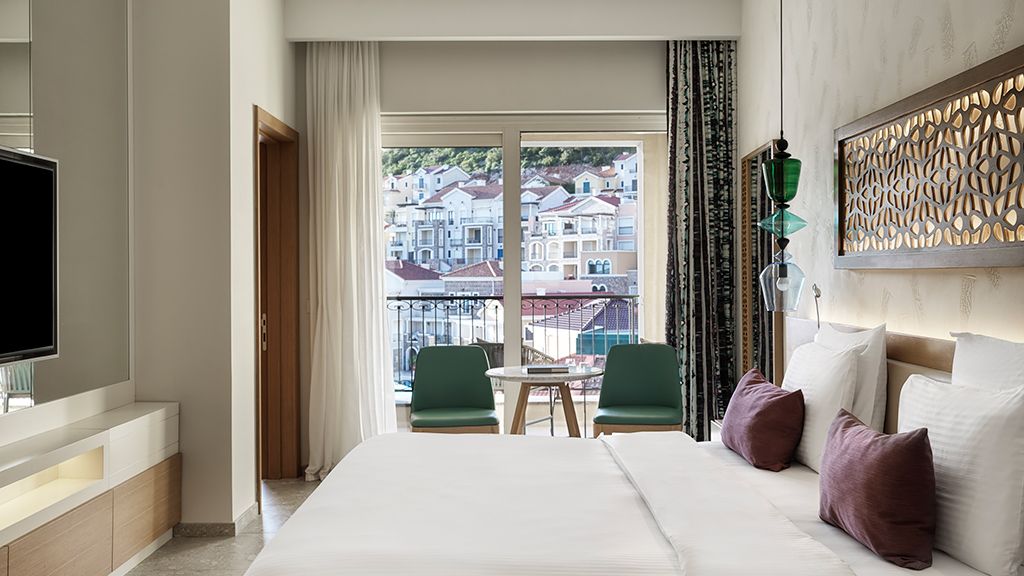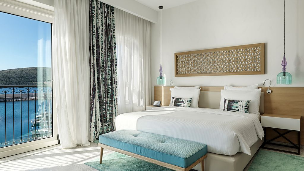 King simmons sweet sleeper bed; up to 2 adultskitchenette with electric stove, microwave, refrigerator, freezer, dishwasher; rechargeable refreshment center; luxury lavazza espresso machine; minibar; wine selection; ceramic and marble bathroom with towel and underfloor heating; double vanity sink; hansgrohe rain shower; freestanding laufen bath; acqua di parma toiletries; separate powder room with toilet; available baby cot; 55’’ interactive led flat-screen iptv; media hub with hdmi & bluetooth connection to tv; bedside usb phone charges; intuitive lighting system; spacious balcony; in-room safe adequate for a laptop; combination of pool, marina, and village views; turn down service; daily breakfast served at the restaurant; complimentary wi-fi; (ground floor rooms with direct access to the pool are subject to availability at the time of arrival