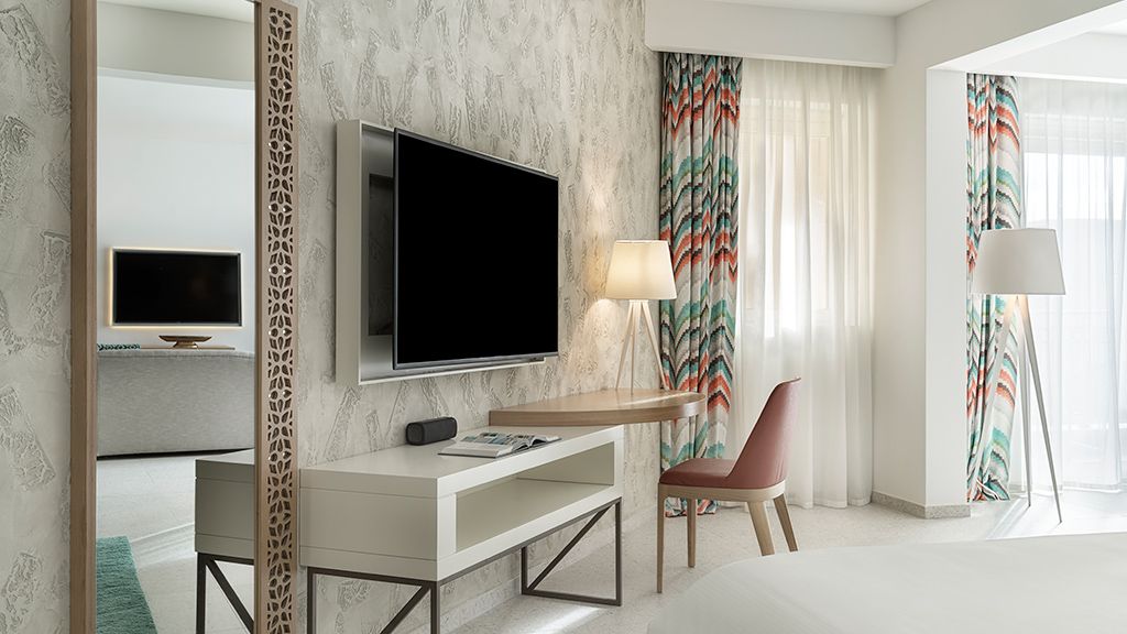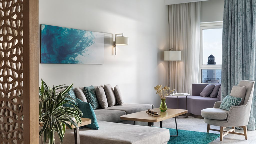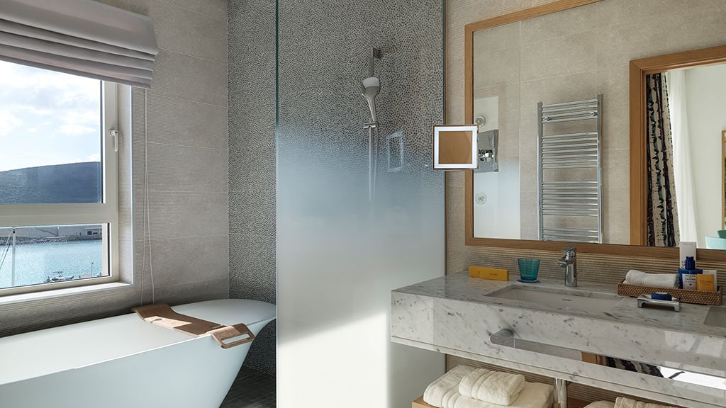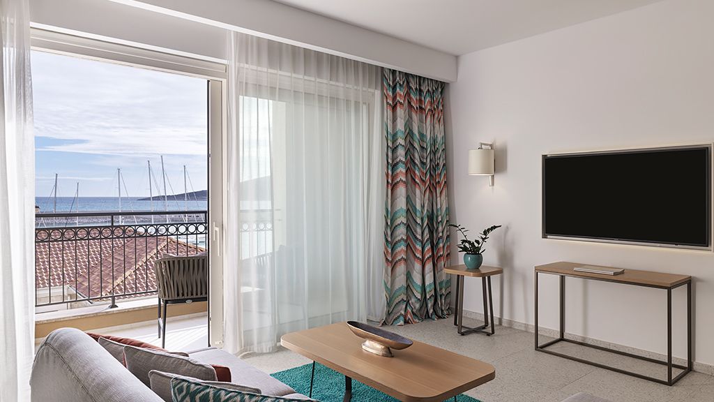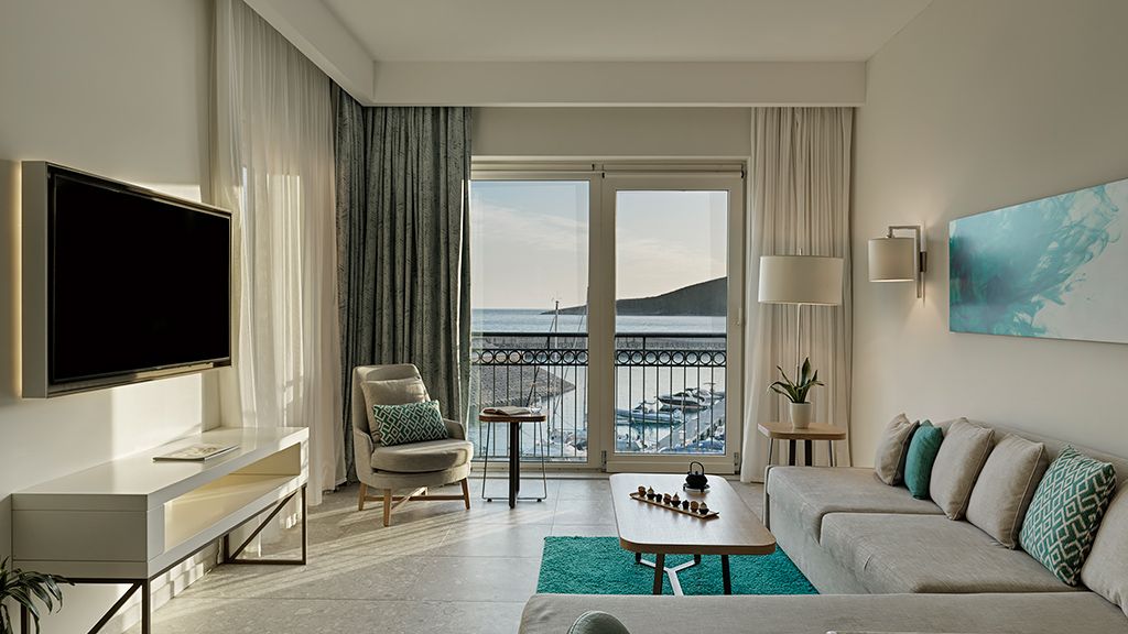 King simmons sweet sleeper bed; maximum 3 adults or 2 adults and 2 children; separate bedroom and living area; rechargeable refreshment center; minibar; wine selection; kitchenette area; ceramic and marble bathroom with underfloor heating; double vanity sink; hansgrohe rain shower; acqua di parma toiletries; separate powder room with toilet; rollaway bed; 55’’ interactive led flat-screen iptv; media hub with hdmi & bluetooth connection to tv; work desk with tv connection; bedside usb phone chargers; intuitive lighting system; in-room safe adequate for a laptop; sea views; turn down service; daily breakfast served at the restaurant; complimentary wi-fi; connecting rooms are available.
