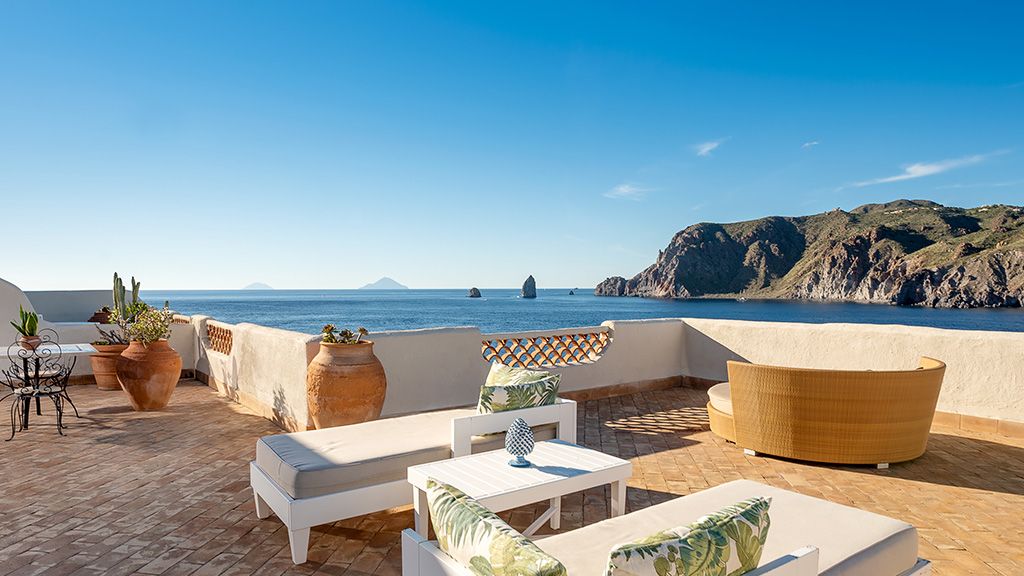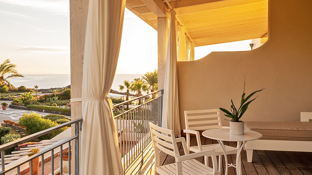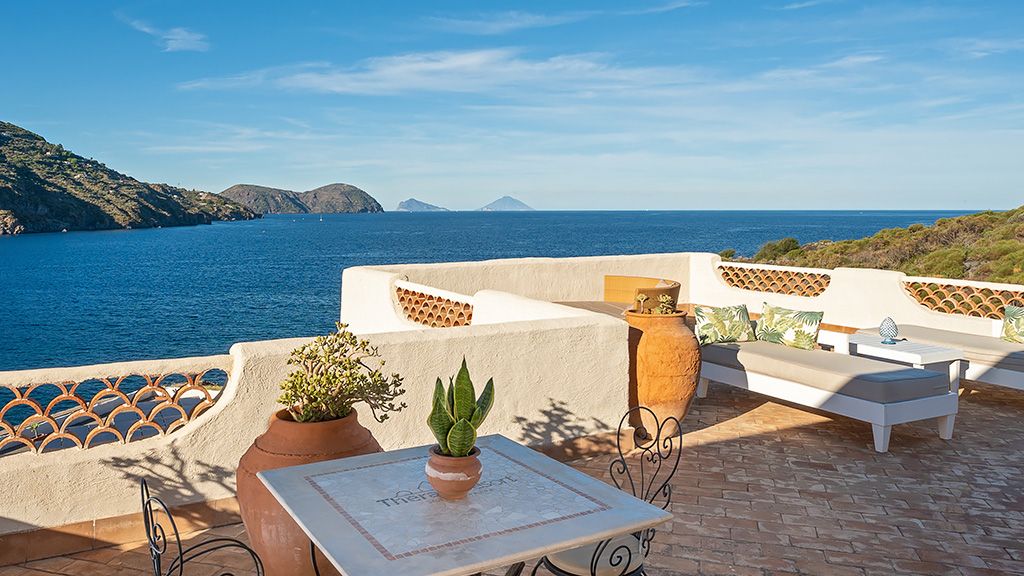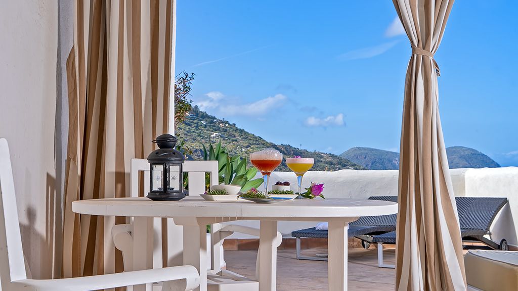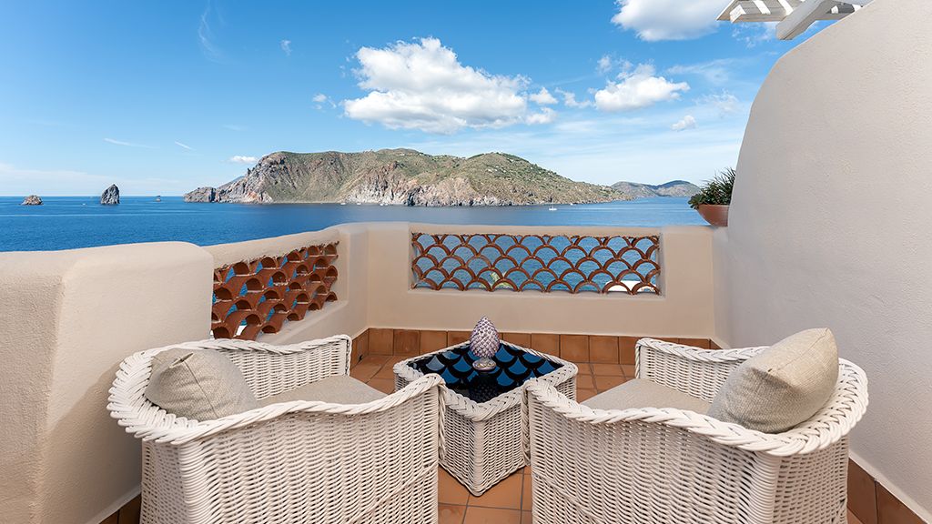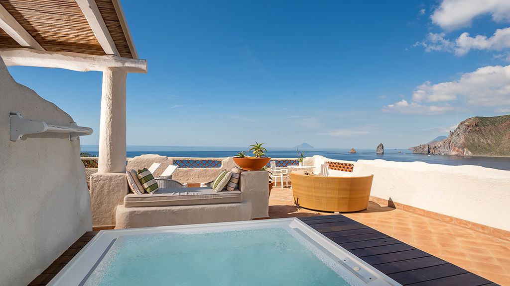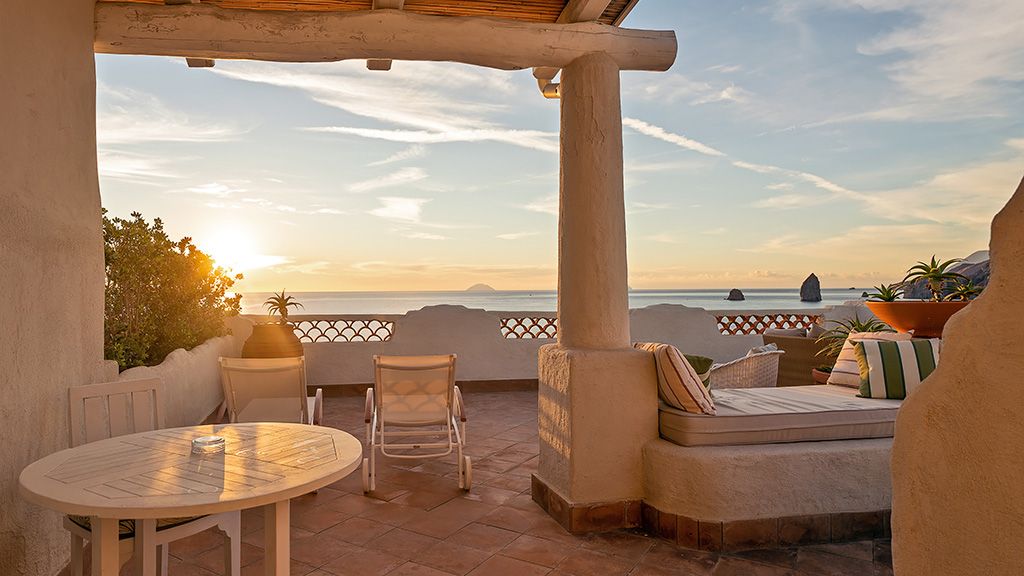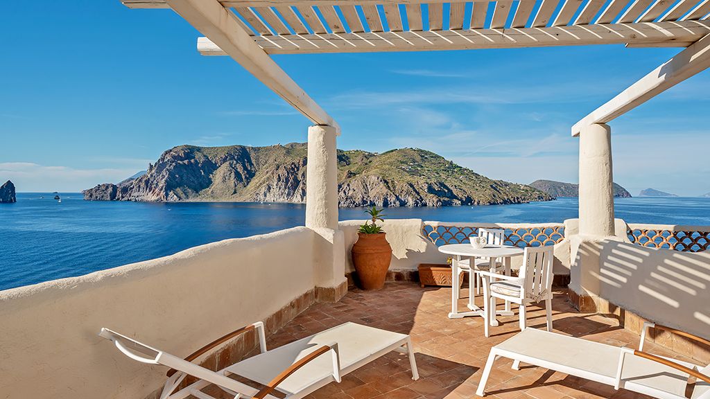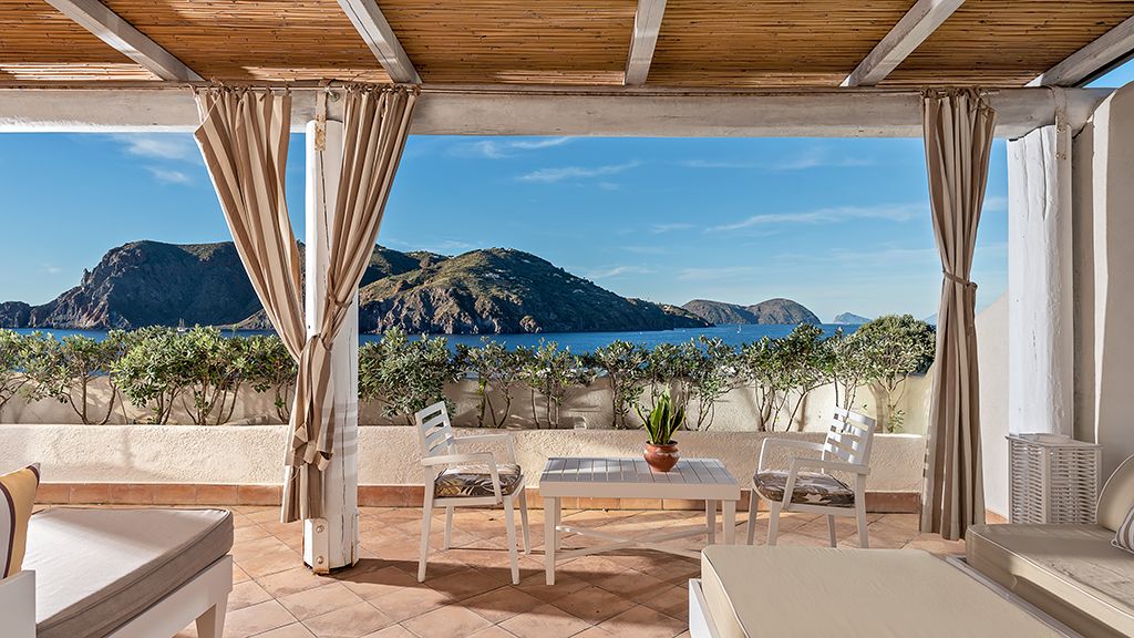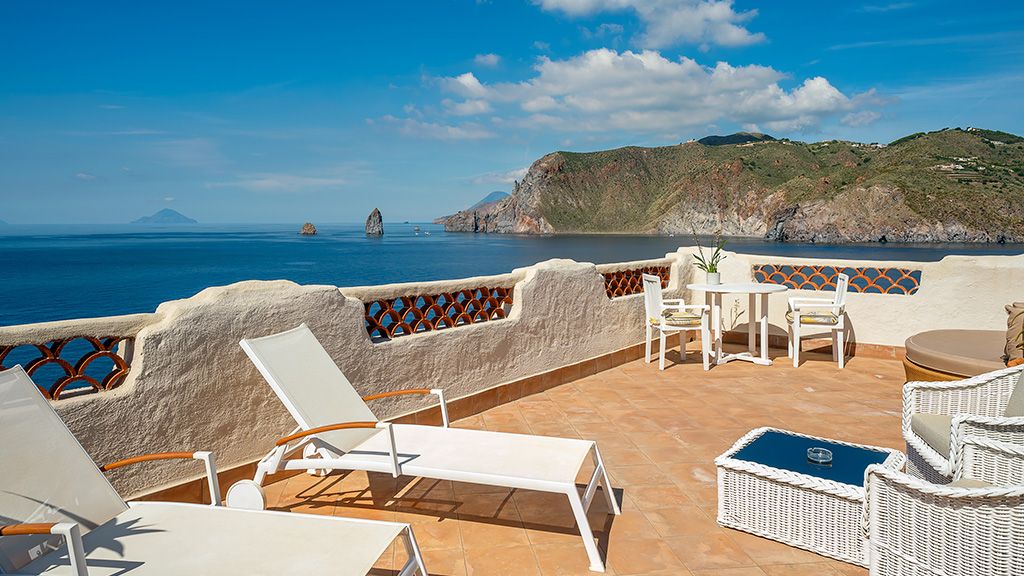 Therasia Resort Sea & Spa sits upon a natural terrace on the northern tip of Vulcano Island, one of seven islands in the Aeolian archipelago off the coast of Sicily. The hotel is reached easily from Catania or Palermo Airports on Sicily via a short hydrofoil ride to Vulcano.