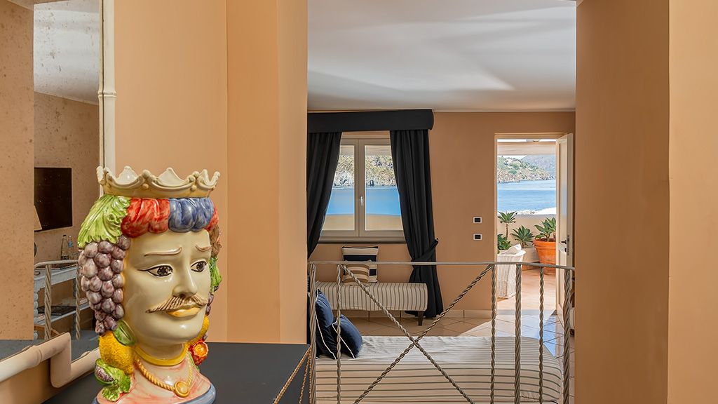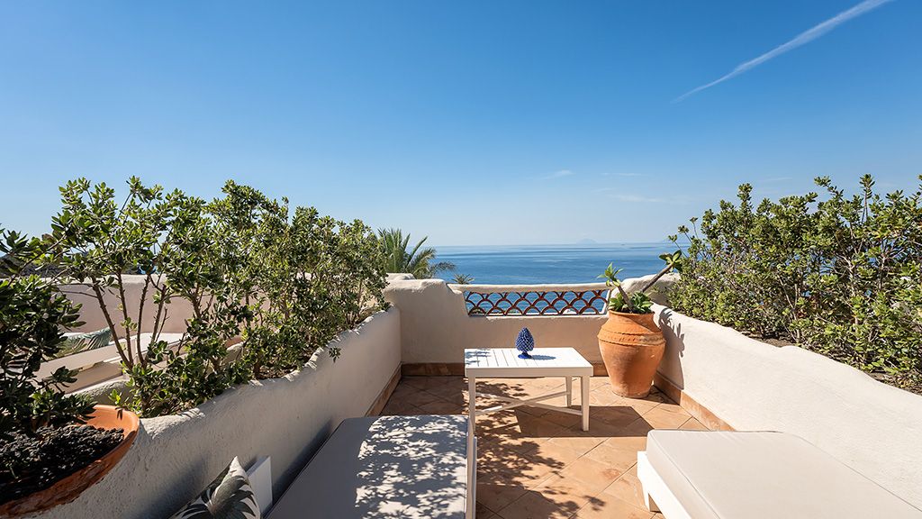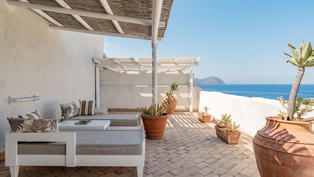 Step off the beaten track and experience the Mediterranean Sea from a spectacular vantage point at Therasia Resort Sea & Spa. This mesmerizing hotel is located upon a natural terrace on the northern tip of Vulcano Island, one of seven islands in the Aeolian archipelago off the coast of Sicily. It’s an island brimming with awe-inspiring landscapes, including black-sand beaches, a volcanic crater, and thermalmud springs.