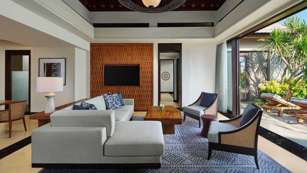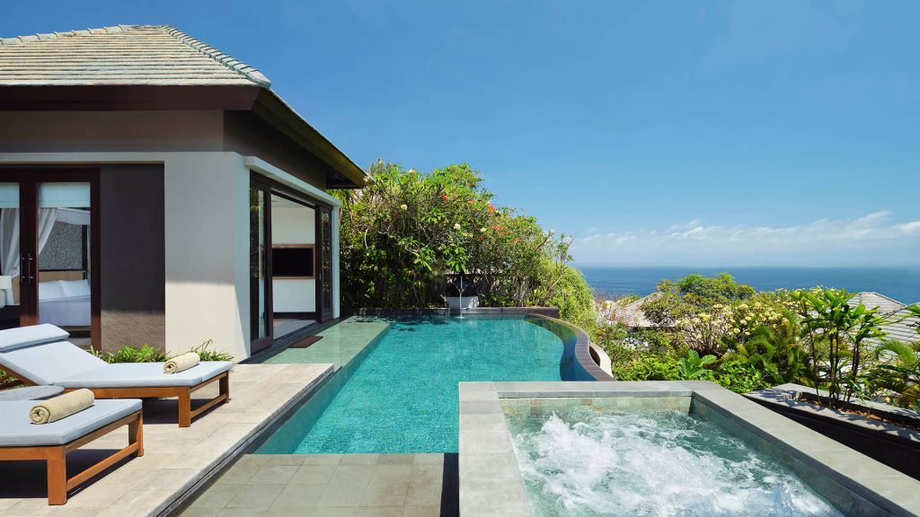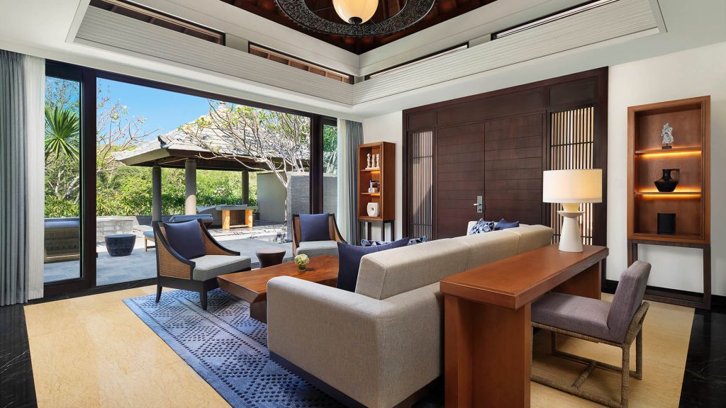 Surrounded by lush green landscapes and partial ocean views, this one-bedroom villa offers a secluded retreat for a truly relaxing getaway. The elegantly designed interiors include floor-to-ceiling windows and sliding doors for maximum light and space. The bedroom presents one king bed with a 55-inch TV and the comfortable living room includes a second 65-inch TV. The bathroom offers a deep soaking tub and a rain shower. Enjoy 115 sq. m. of furnished outdoor space, including sunbeds and a dining area. Standout amenities include a private infinity pool, a hot tub, and an outdoor rain shower to stay refreshed. Additional amenities include complimentary WiFi, an espresso machine, minibar, pillow menu, bathrobes and slippers, and safe. Sleeps 2 adults and 1 child with a rollaway bed.