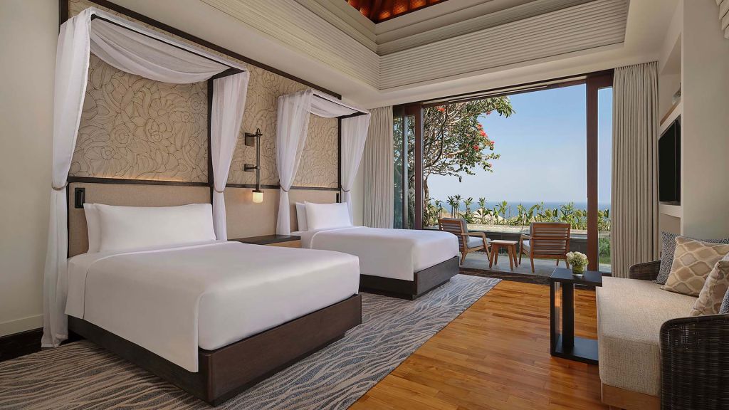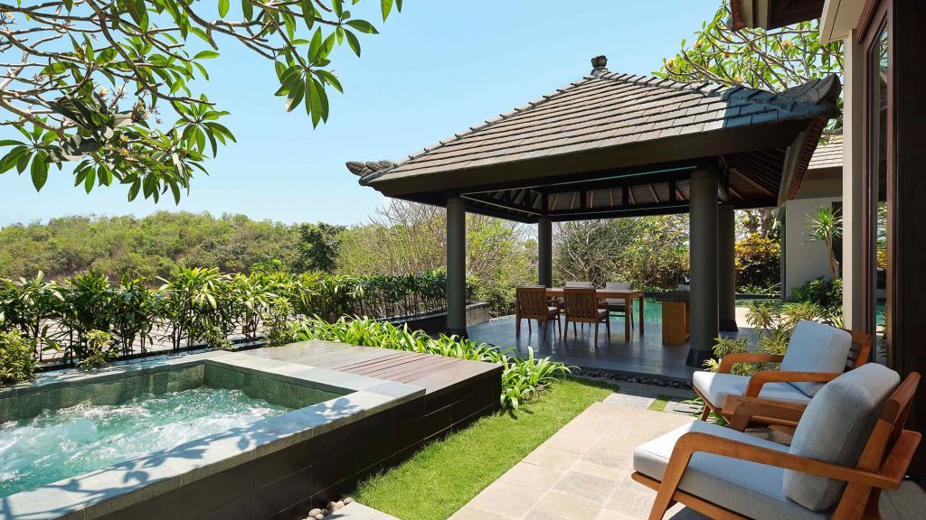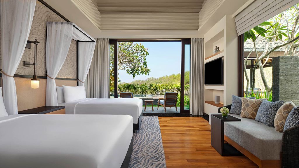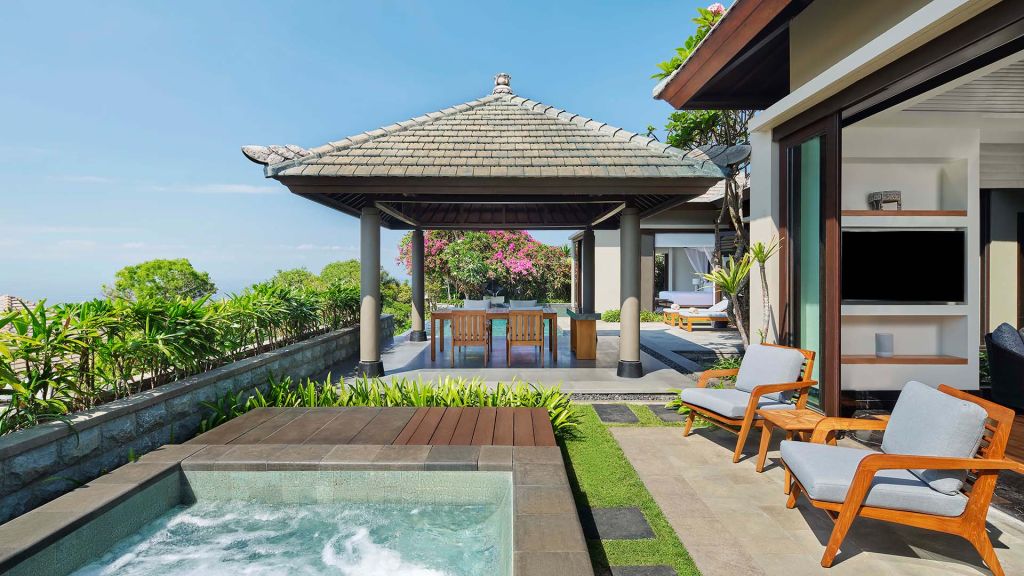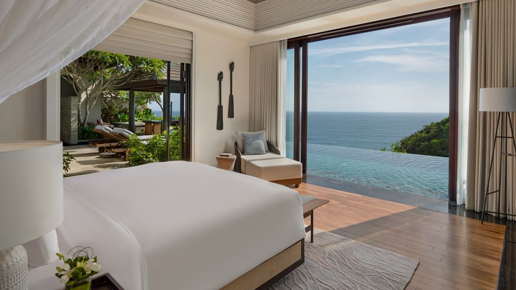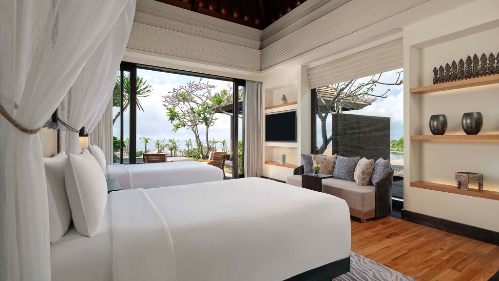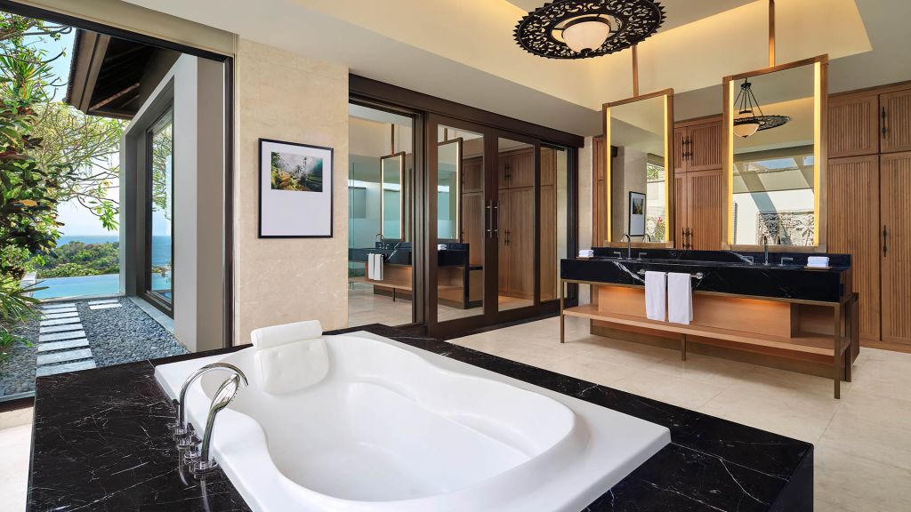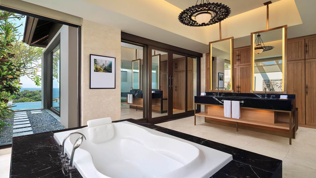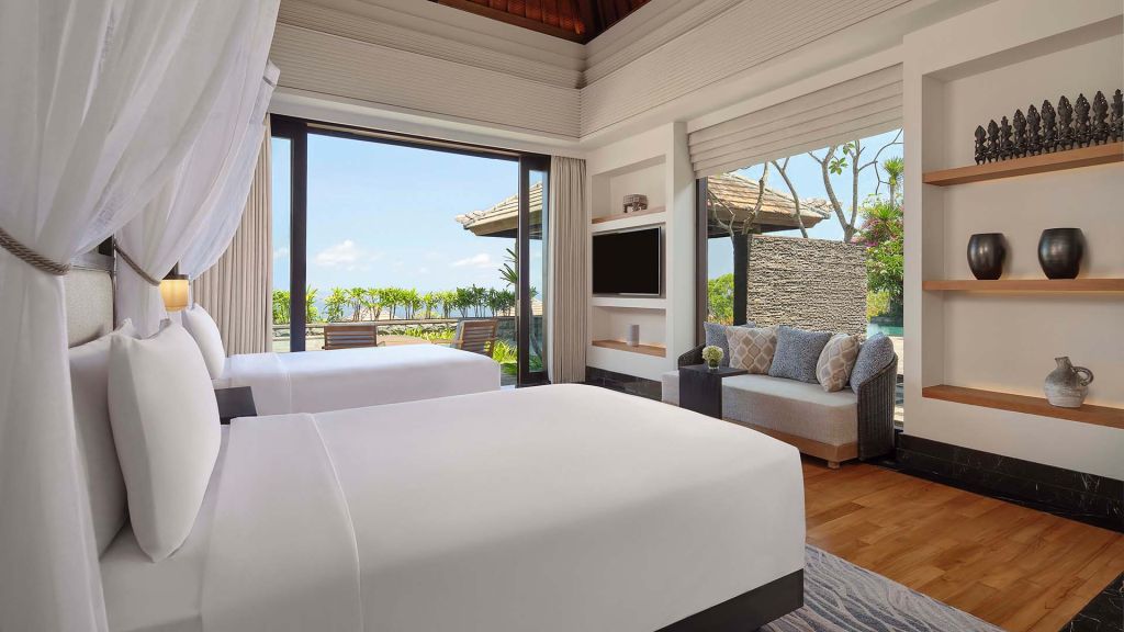 Surrounded by lush green landscapes and partial ocean views, this two-bedroom villa offers a secluded retreat for a truly relaxing getaway. The elegantly designed interiors include floor-to-ceiling windows and sliding doors for maximum light and space. The master bedroom presents one king bed with a 55-inch TV and the second bedroom features two twin beds. The comfortable living room includes a 65-inch TV. Two separate bathrooms each offer a deep soaking tub and a rain shower. Enjoy 200 sq. m. of furnished outdoor space, including sunbeds and a dining area. Standout amenities include a private infinity pool, a hot tub, and an outdoor rain shower to stay refreshed. Additional amenities include complimentary WiFi, an espresso machine, minibar, pillow menu, bathrobes and slippers, and safe. Sleeps 4 adults and 2 children with rollaway beds.