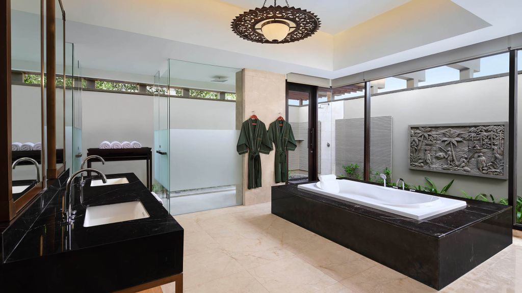 Surrounded by tropical garden views, this two-bedroom villa offers a secluded retreat for a truly relaxing getaway. The elegantly designed interiors include floor-to-ceiling windows and sliding doors for maximum light and space. The master bedroom presents one king bed with a 55-inch TV and the second bedroom features two twin beds. The comfortable living room includes a 65-inch TV. Two separate bathrooms each offer a deep soaking tub and a rain shower. Enjoy 200 sq. m. of furnished outdoor space, including sunbeds and a dining area. Standout amenities include a private infinity pool, a hot tub, and an outdoor rain shower to stay refreshed. Additional amenities include complimentary WiFi, an espresso machine, minibar, pillow menu, bathrobes and slippers, and safe. Sleeps 4 adults and 2 children with rollaway beds.
